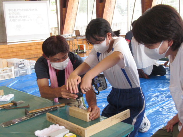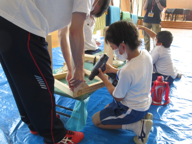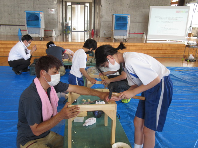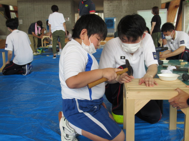 6月21日(火)、6年生が能登ヒバを使ったイス作りワークショップを体験しました。星稜大学さん、かほっくるさん、オフィスプランZENさん、ダイナムさん、かほく市社会福祉協議会さん、保護者の皆様、そして沢野建設工房さん。たくさんの方々のご協力をいただき、かほっくるに寄贈するイスを製作しました。沢野建設工房さんに設計していただいたイスは、子ども達でも作りやすく設計されています。はじめは恐る恐る作業をしていた6年生でしたが、工具の扱いに慣れてくるとスイスイと工程を進め、教えてくださる方々と一緒に素敵なイスを完成させました。かほっくるに行けばいつでも見られる、立派な卒業制作ができました。