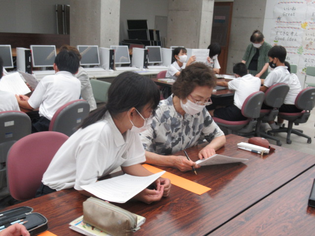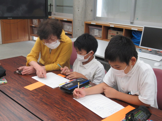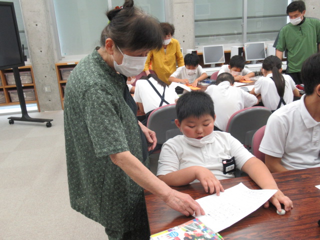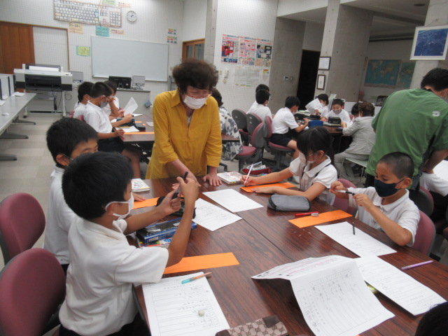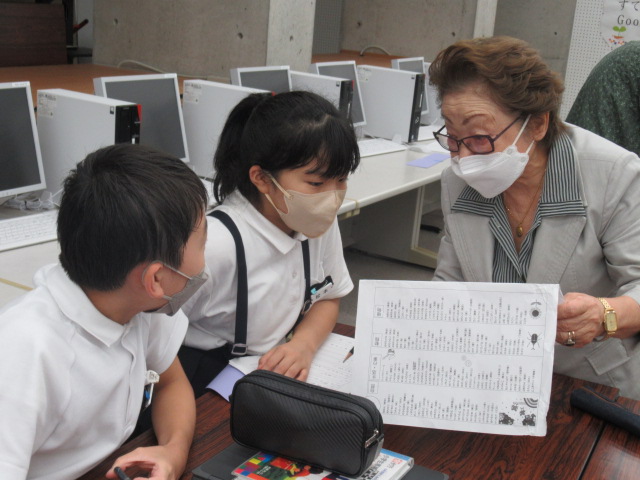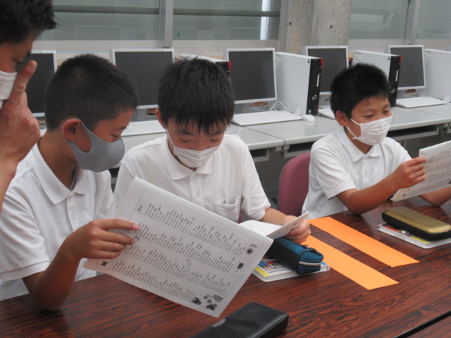 金津小の子ども達は季節ごとに俳句を作っています。今回は夏の俳句を5・6年生が、七塚の俳句サークル「木犀会」のみなさんに添削をしていただきながら、改めて俳句の詠み方を教わりました。4つの班に分かれて、各班に木犀会の方々に入って指導していただきました。子ども達は、「前より良い俳句になって良かった」「去年も教えてもらったけど、それよりもいいものになった」と感想を述べていました。