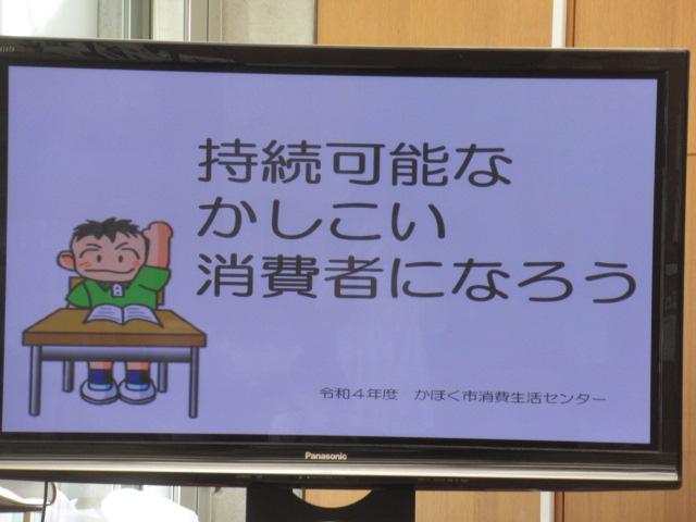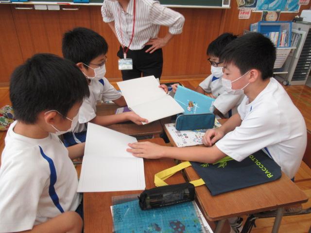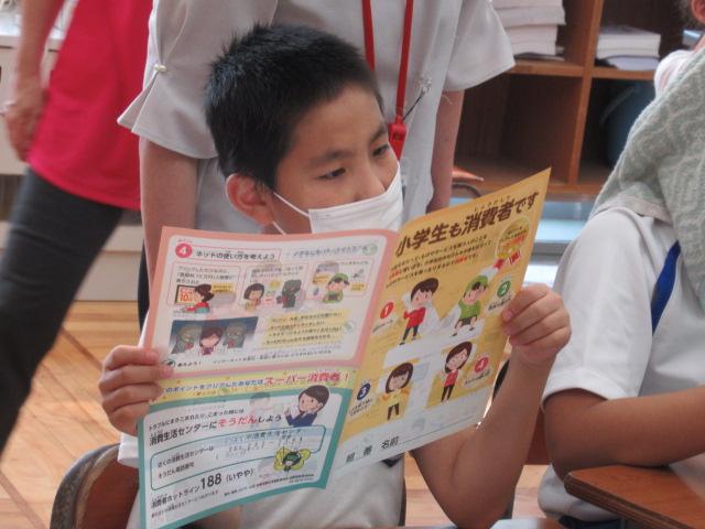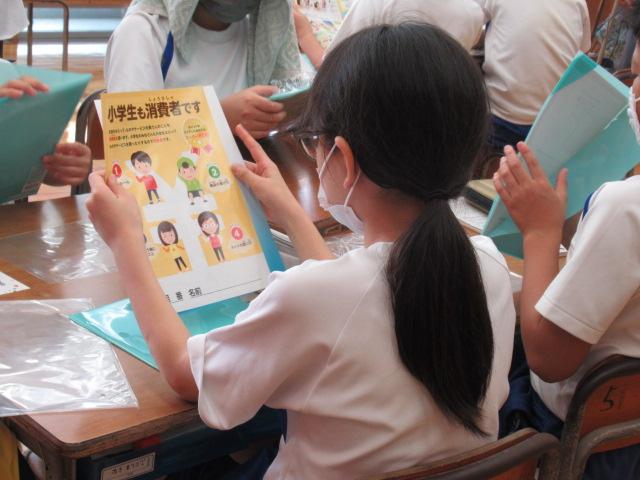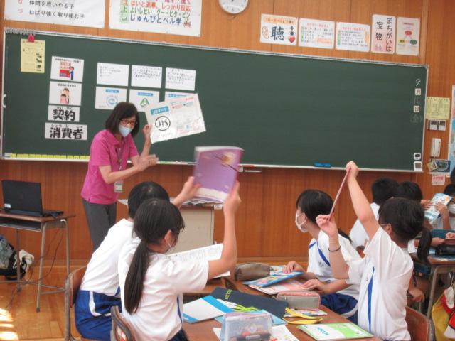 9月9日と16日、5年生を対象に市消費者センターの方々による消費者教育の教室が開かれました。9日には契約と消費者について学び、小学生でも「消費者」なのだと学びました。16日には実際にノートを比べて「買うとしたらどれにする?」と子どもたちに問いかけました。「キャラクターが描いてあると授業に集中できない」「これは再生紙を使ってる」など、子ども達みんなが理由をしっかり考えていました。お金の使い方や、品物の選び方など、これまでの生活を見直し考えていくよい機会となりました。