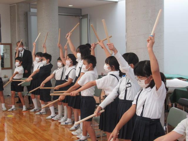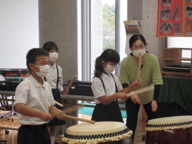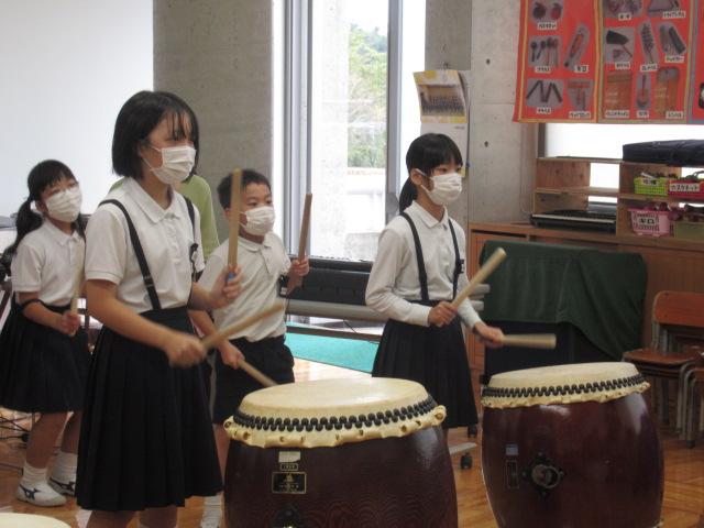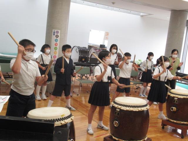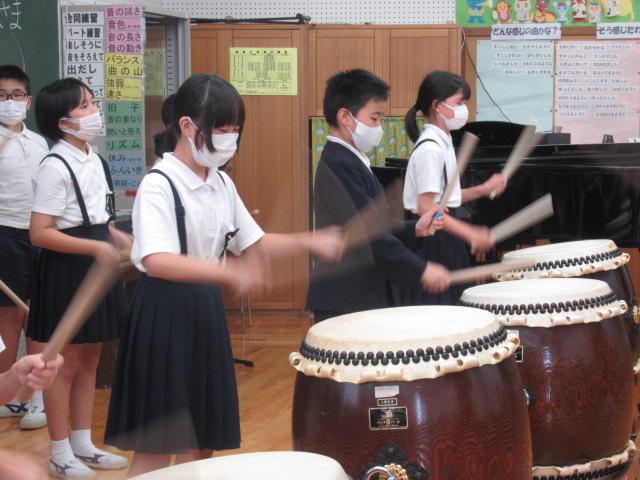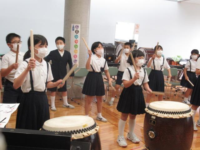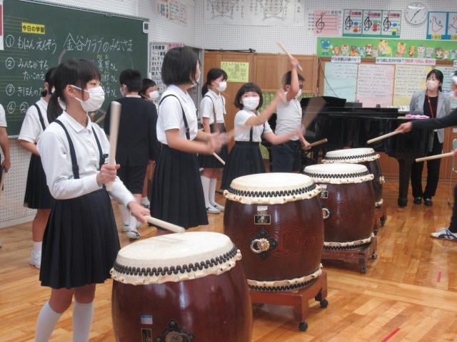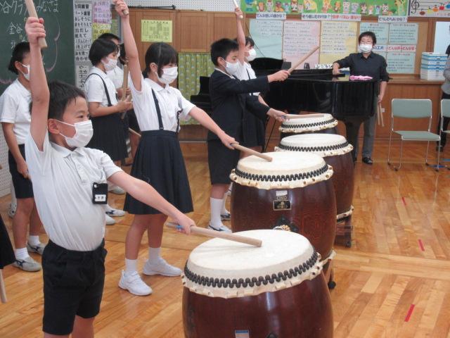 10月5日(水)、高松の太鼓グループ「金谷クラブ」のみなさんに和太鼓の指導をしていただきました。大迫力の演奏を見せていただき、子ども達は圧倒されていました。実際に叩くときには、はじめはおっかなびっくり叩いていた子も、終わりごろには「ドン!」と力強く、掛け声やジャンプもしながら叩くことができるようになりました。今回教えていただいた演奏は、収穫感謝祭で披露する予定です。