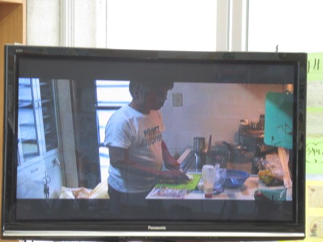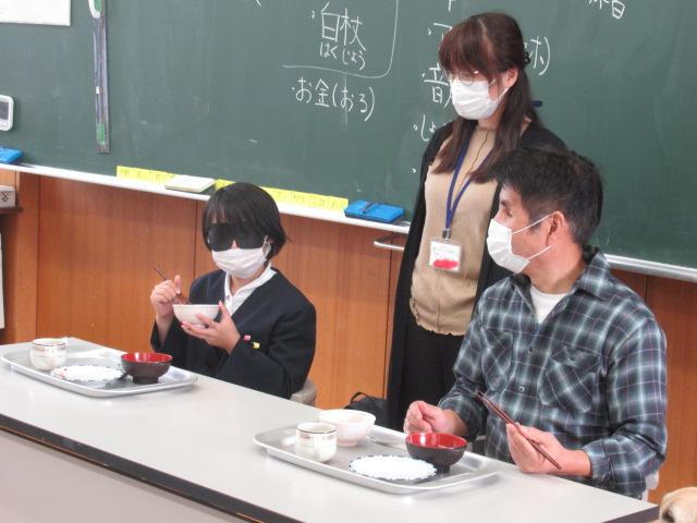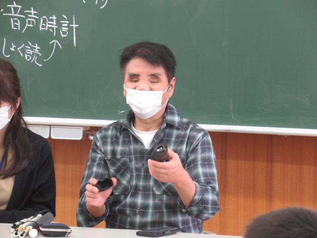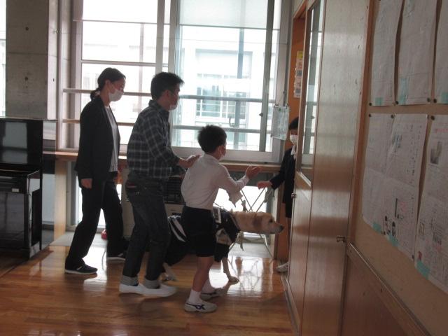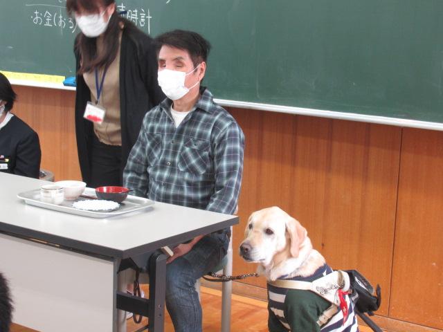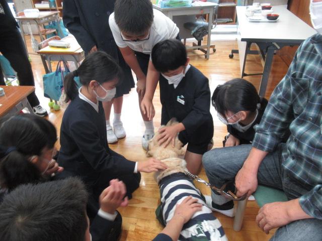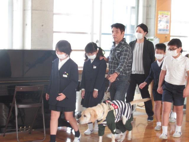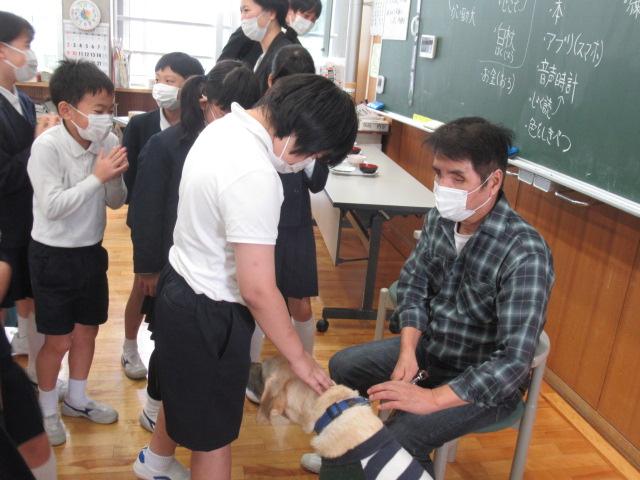 かほく市社会福祉協議会のご協力で、西寿一さんと盲導犬のウーノくんをお招きし、視覚障害がある方の生活について学びました。音声で時間を教えてくれる時計、本を音声データで楽しむ機械、色を識別する機械など、生活を支える道具を見せてもらいました。また、アイマスクをしてお皿やお椀がどこにあるか指示を聞きながら、目が見えない状態での食事を疑似体験しました。体験した児童は、「お椀を倒しそうで怖かった」と感想を述べました。日常の様子の動画では、キャベツの千切りやポテトサラダを作る様子、ウーノくんと道路を歩く姿を見せていただきました。西さんの自宅へしっかり誘導するウーノくんの姿に子ども達は「賢い」「すごい」と驚いていました。ハーネスを外して「お仕事モード」を解除したウーノくんと触れ合うこともでき、子ども達はとても喜んでいました。お礼に子ども達からは「WAになって踊ろう」の歌をプレゼントし、西さんからは「元気をもらえました」とお言葉をいただきました。