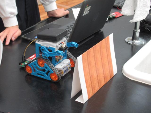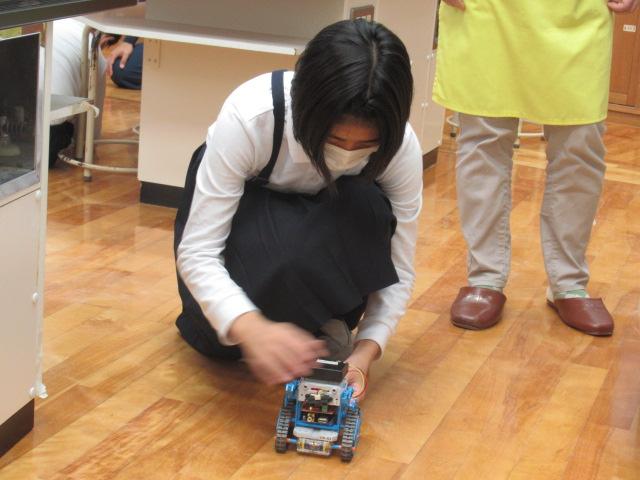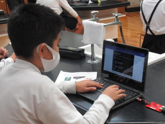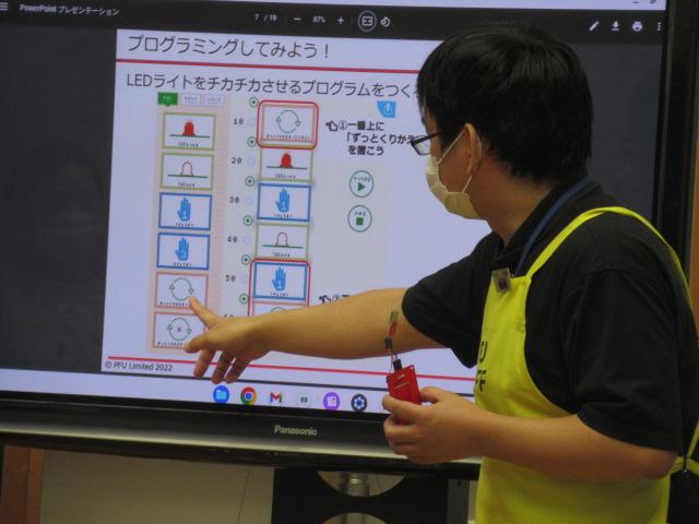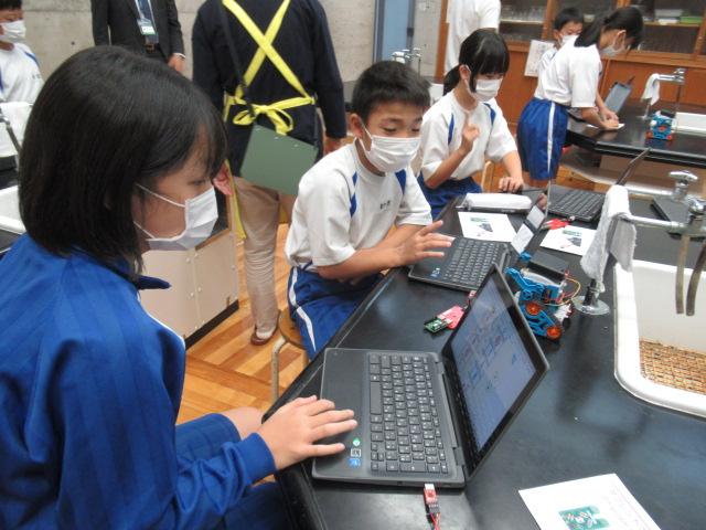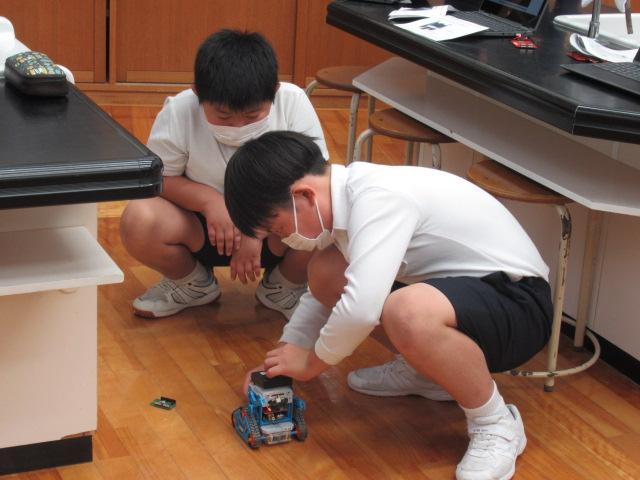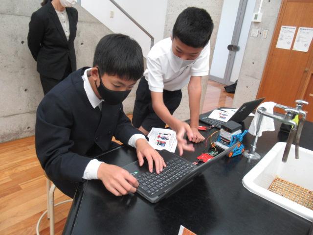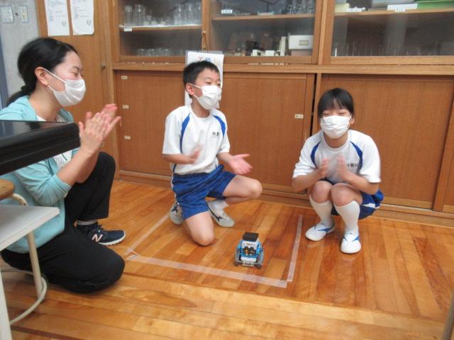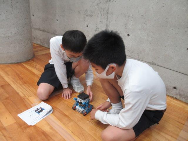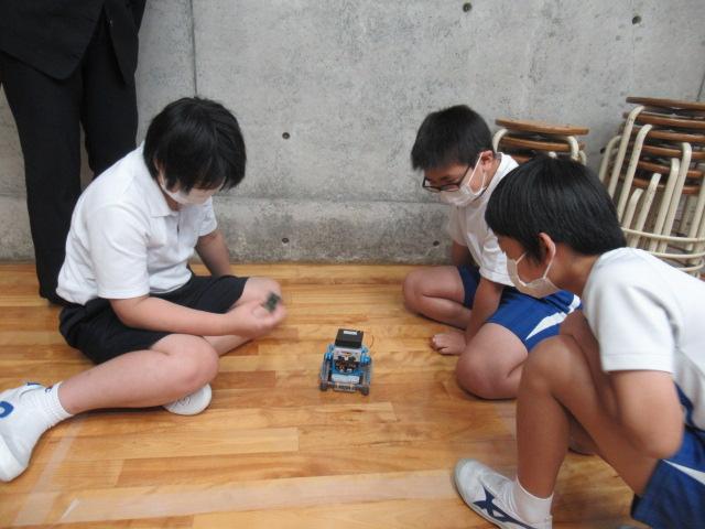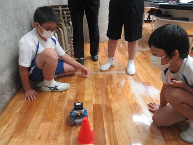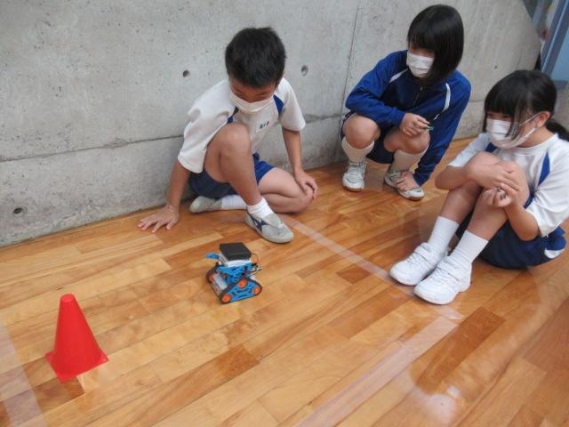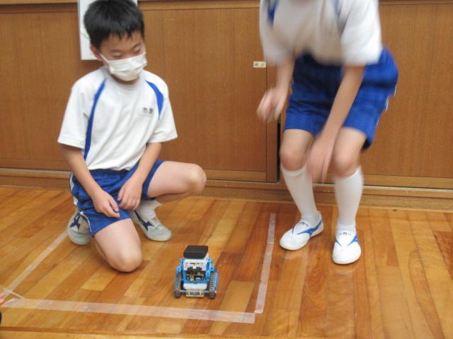 4年生と6年生が、PFUの方にプログラミングについて教えていただきました。タブレットにつないだIchoigoJamを使って、ロボットを動かしました。4年生は画面に出ているイラストのパネルで指示を入力し、ロボットをUターンさせるには何秒回るよう入力すべきなのかを何度も実験していました。6年生はコマンドを入力してプログラムを作りました。ロボットにセンサーで感知させて壁の前に来ると止まる指示を作りました。どちらの学年も悪戦苦闘しながら、とても楽しんで学ぶことができました。