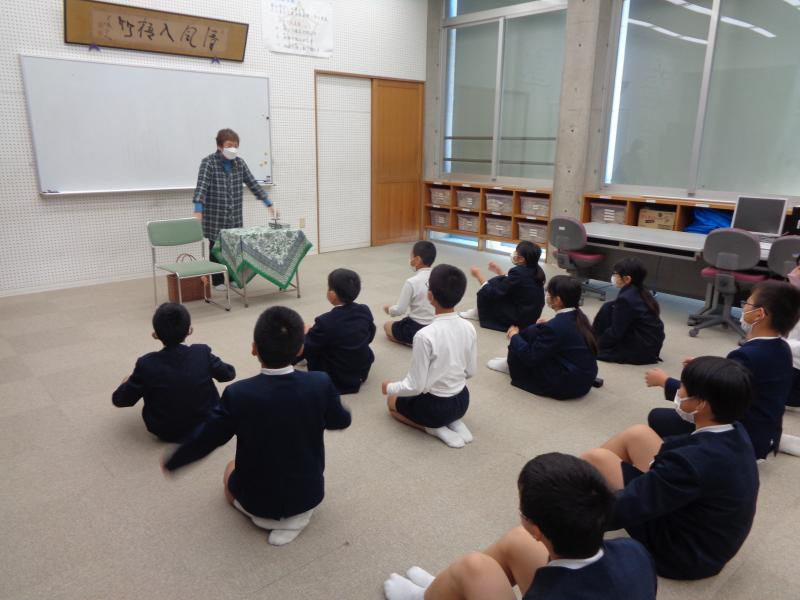 やまんばの会の長山さんと高井さんに、今回は5年生が読み聞かせをしてもらいました。まどみちおさんとくどうなおこさんの詩や、写真絵本の「棚田を歩けば」を聞き、間に「お皿にお箸に」といった手遊びをはさみつつ、最後は素話で日本の昔話の「沼神の手紙」をお話していただきました。特に「沼神の手紙」では、5年生みんなが息をのんで聞き入っていました。