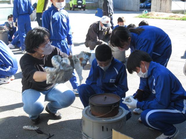10月20日(木) 5・6年生は、朝から炭焼き体験をしました。初めに、炭ができる仕組みや炭のよさについて、「金津の森プロジェクト」の先生方と一緒に学習しました。次に、外に出て、自分たちが持ってきたものをダッチオーブンに入れて炭づくりをしました。火起こしや火を絶やさないために薪をくべる作業も行いました。保護者の方もボランティアに来てくださり、教室に戻って子供達が学習をしている間に火が消えないようにと火の管理をしてくださいました。 お昼には、炭づくりと同時に、お肉やウインナー、そして、デザートにマシュマロやさつまいもも焼いてもらいました。楽しい炭づくりとおいしいバーベキューとで5・6年の子供達は大満足の1日だったようです。 お世話をしてくださった金津の森プロジェクトの皆様、ボランティアの皆様、本当にありがとうございました。