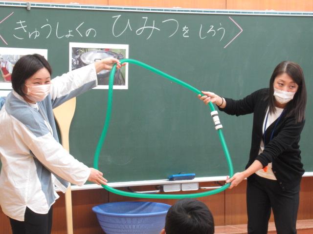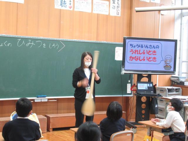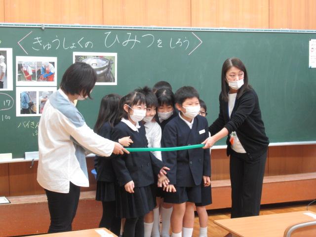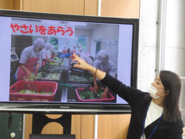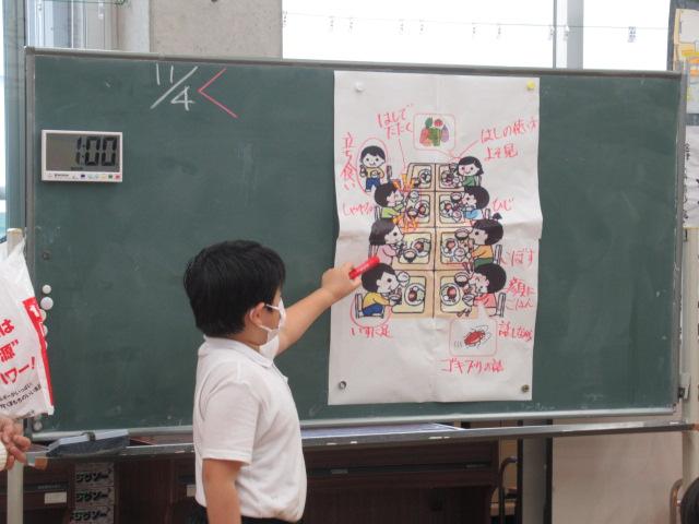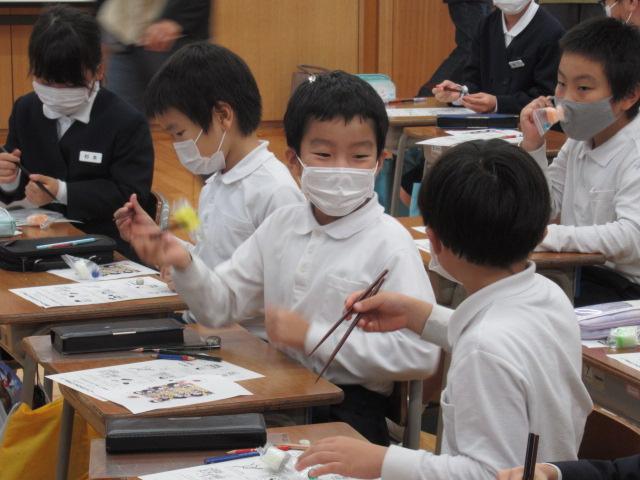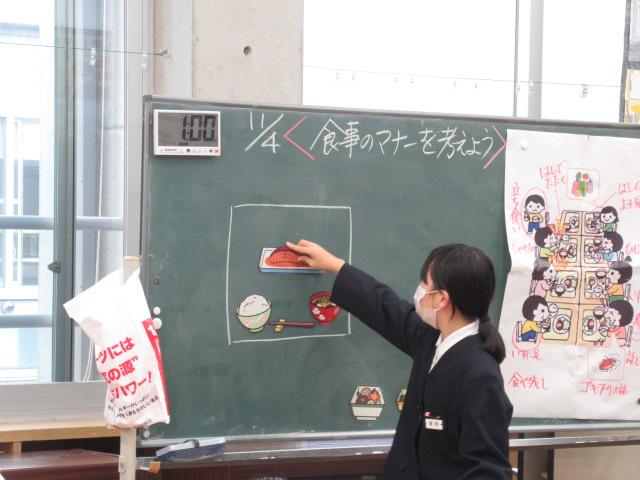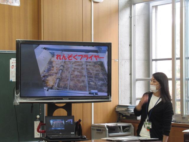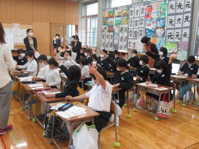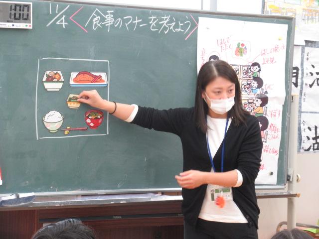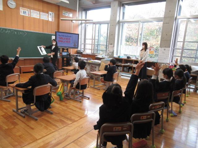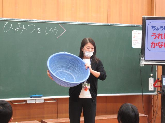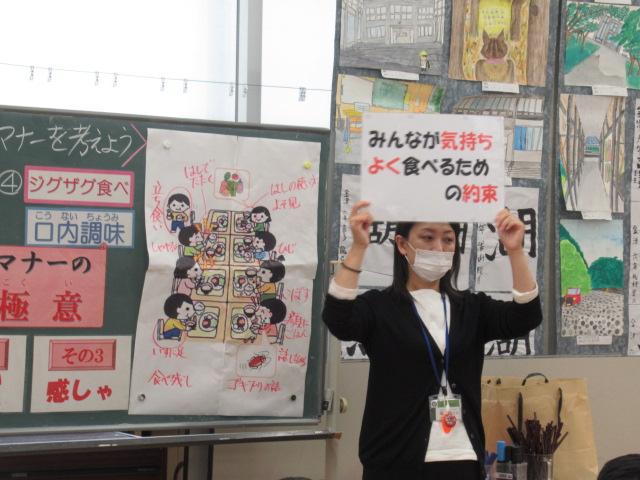 管理栄養士の堀いづみさんを講師に、低学年と中学年がそれぞれ食育講座を受けました。低学年のテーマは「給食のひみつ」。調理師さんたちがどんな服装や器具で作っているのかを映像や写真で見せてもらいました。また、栄養バランスについてもわかりやすく説明していただきました。調理に使っているお鍋の直径を再現したホースには児童が10人も入り、大きさに子ども達はとても驚いていました。中学年のテーマは「食事のマナーを考えよう」。食事中にしてはいけないことをイラストの中から見つけて発表してみたり、姿勢がよく嚙む力や消化につながっていること、和食の配膳の仕方、「ジグザグ食べ」をすることで日本人にしかできない「口内調味」をしていること、正しい箸の持ち方など、たくさんのことを教えていただきました。今日学んだことをさっそく、お昼の給食やおうちでの食事で実感しながら食べてほしいです。