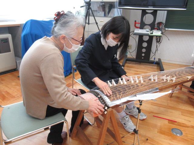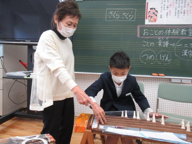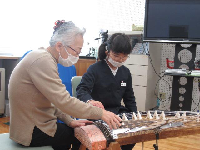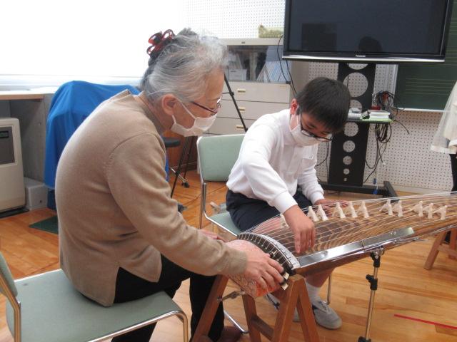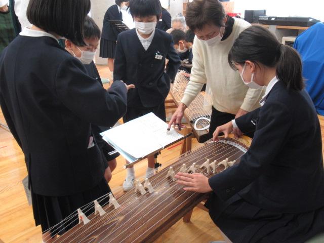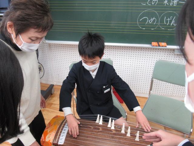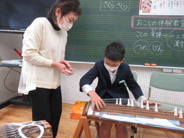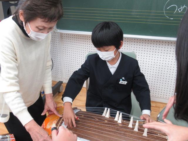 11月14日(月)、榊原文子さん、朝日喜代美さん、細川啓子さんをお招きし、4年生がお箏を学びました。はじめに「赤とんぼ」や「もみじ」などの秋にまつわる曲を演奏していただき、お箏の生演奏に4年生は「すごい・・・」と息をのんでいました。演奏を聞いた後は、一人ひとりが「さくらさくら」を教えていただきました。譜面が漢数字であることや、演奏する際に着ける爪、そして弦の硬さなど、初めてのことばかりで戸惑いながらも、交替しながらの練習では待機している子が音階を読み上げてサポートしたり、イメージトレーニングをして自分の番に備えたりなど、みんなが頑張る姿が見られました。