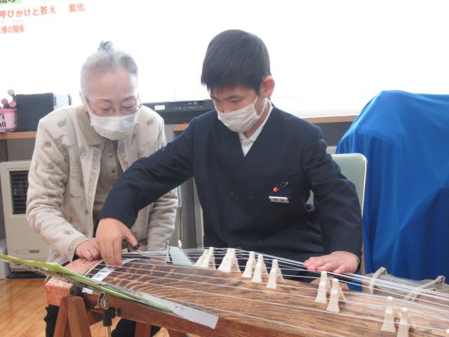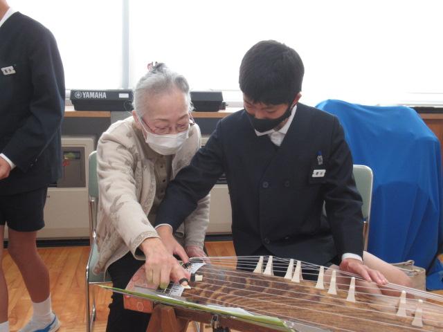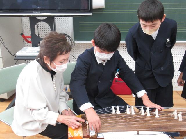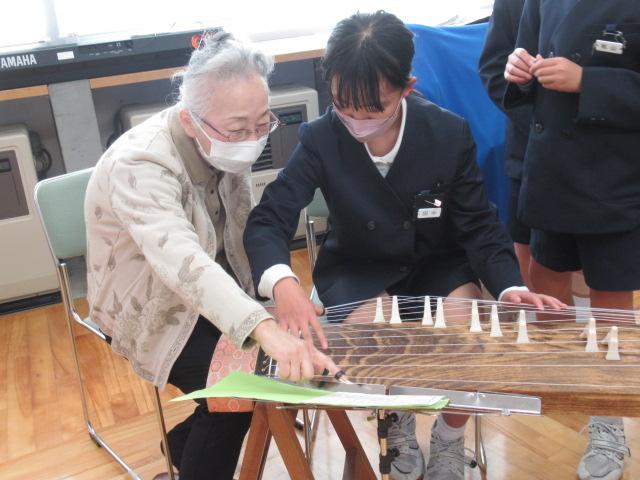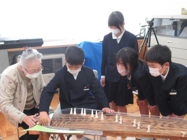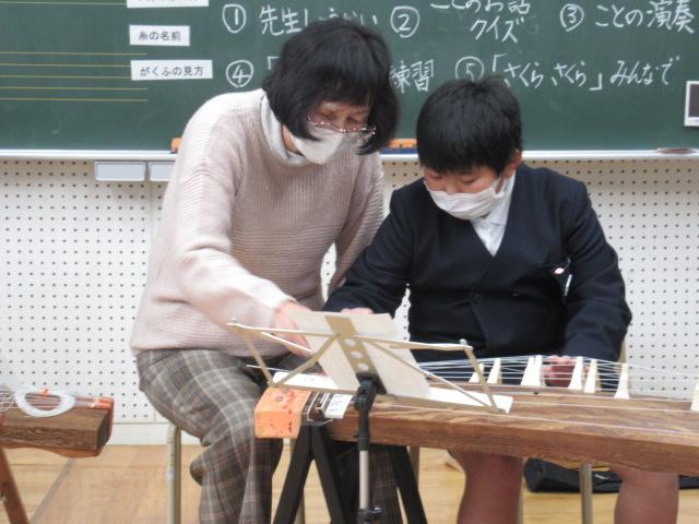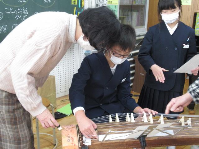 11月17日(木)、月曜に引き続き、今回は5・6年生がお箏の体験をしました。樹の歌、荒城の月、六段の調べと、4年生の授業とは異なる演奏を聞かせてくださいました。5・6年生は一昨年から「さくらさくら」を習っていますが、やはり1年経つと忘れてしまうのか、弦の位置や譜面の読み方を思い出しながら、一生懸命教わっていました。最後にはどちらの学年も、上手に弾くことができるようになりました。