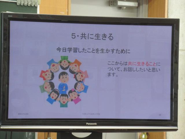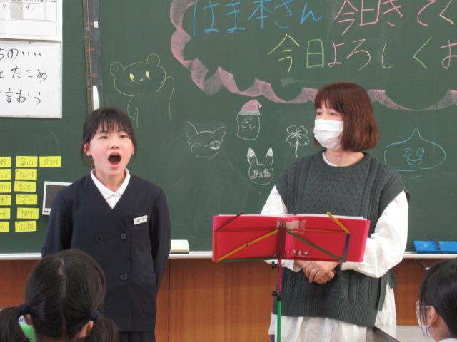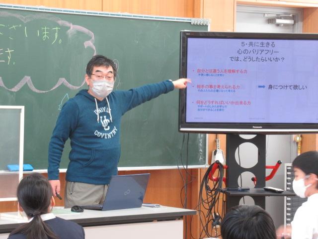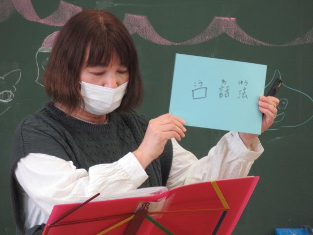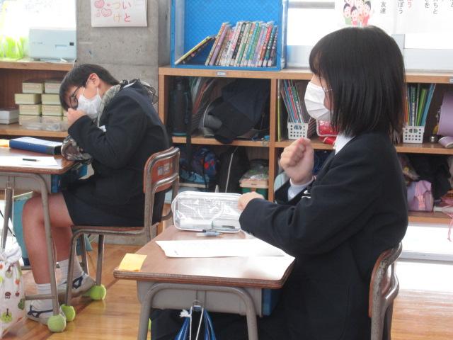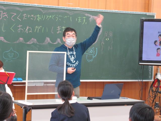 かほく市社会福祉協議会からの紹介で、今年度も濱本龍文さん、真由美さんご夫妻をお招きし、聴覚障害がある方について学びました。聴覚障害にも種類があること、補聴器での聞こえ方、手話以外のコミュニケーションの取り方(口話法、筆談、要約筆記)などについてお話いただき、実際に子ども達に口パクで「顔」と「青」など似た言葉のどちらを言ったのかクイズをさせて、口の動きを読むことの難しさを楽しく学ばせてくださいました。また、セルフアドボカシー(体の不自由な方が周りに助けを求める力)という概念や、障害がある方と接するときに不安を感じたりするのは自然なことで、そこから行動を起こすときに間違った感情を持たないためには正しい知識を身に着けることが大切だということも教えていただきました。子ども達は最後に、教えていただいた手話の「ありがとう」で濱本さんご夫妻に感謝の意を伝えました。