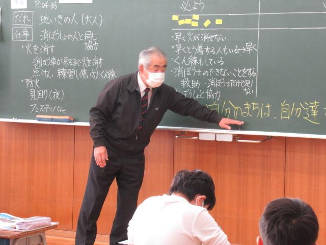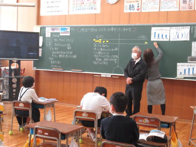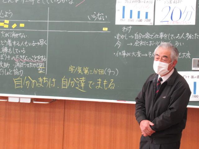 先日に引き続き、元消防長で上田名区長の奥野司郎さんに、今回は消防団の仕事について教えていただきました。子ども達は消防団がなぜ必要なのかを教科書などの資料から調べて自分の考えをまとめ、発表しました。奥野さんからは、消防団の人数が減ってきている理由、火事の現場で消防士だけでなく応援要員としてとても大切であること、また、毎月1日と15日に防火の見回りをしていることや、災害の際の働き、さらに行方不明者の捜索にも消防団の協力があることを教えてくださいました。火事の時のことばかり意識が向いていた子どもたちは、災害や行方不明者の捜索にも消防団が関わっていると知り、とても驚いていました。