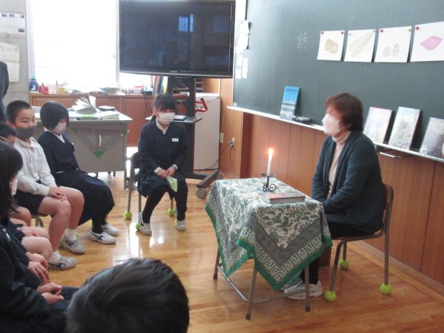 3年生が読み聞かせボランティア「やまんばの会」の長山さんと高井さんに、読み聞かせをしていただきました。いろんなお芋が出てくる手遊びでは、最初にどんなお芋かイメージしやすいよう、「山芋」や「里芋」のカードを見ながら楽しんでいました。絵本「おおはくちょうのそら」では、病気の子どもの白鳥をおいて北に行かなければならない自然界の厳しさと、ひなの鳴き声に引き返してきて最期を看取る家族の温かさを感じるお話で、子ども達は静かに聞いていました。3年生は現在、韓国の民話「3年峠」を国語で習っている最中ということで、韓国の民話のひとつである「あずきがゆばあさんととら」も読んでいただきました。日本の「さるかに」と似ているけれど、もっとすごい展開に、「ひゃー!」と声が上がっていました。韓国では100年ほど前まで虎が生活に身近な動物だったこともあり、虎が登場する民話がたくさんあるそうです。最後に「かめのこうらはひびだらけ」をいうブラジルの昔話は、カメの甲羅を改めてながめたくなるようなお話でした。世界の昔話にたくさん触れることができた45分でした。