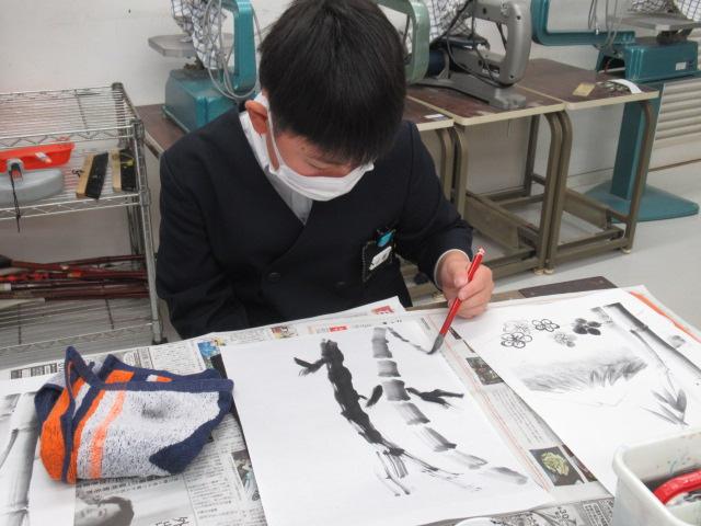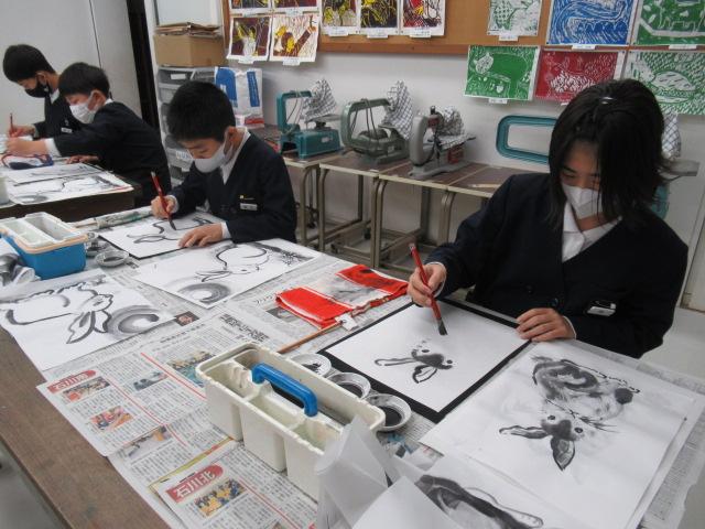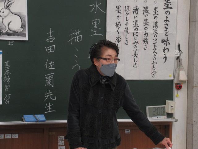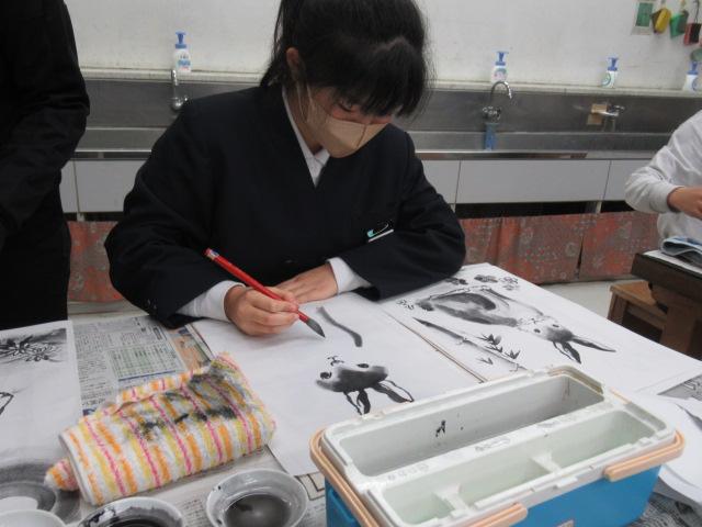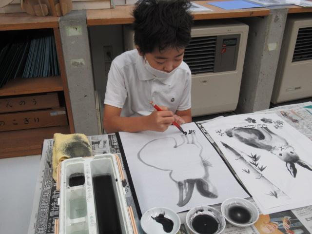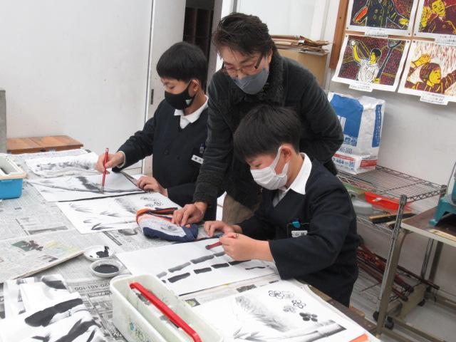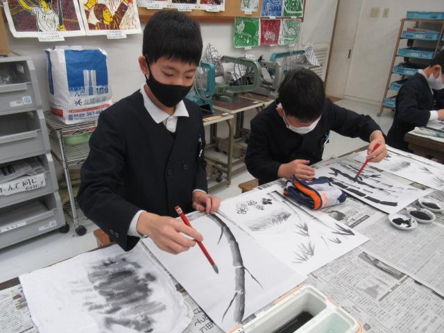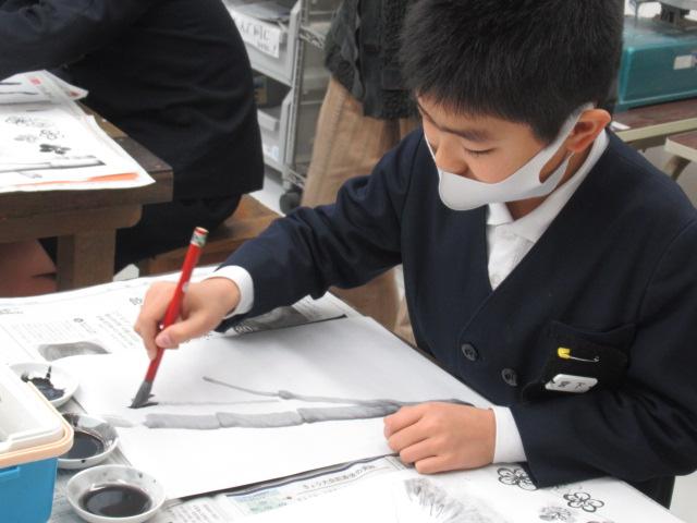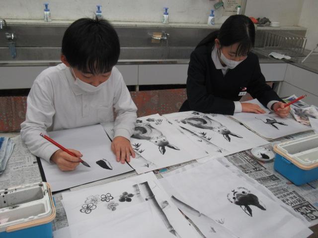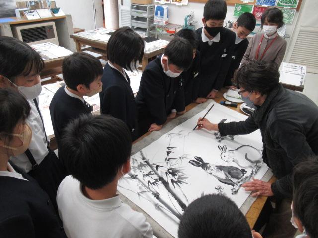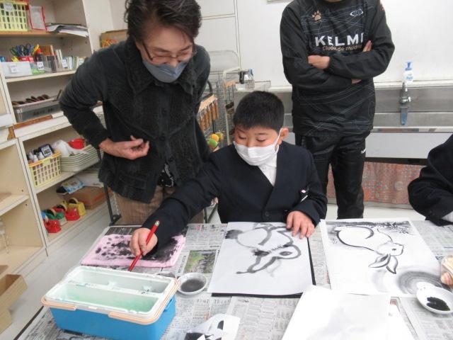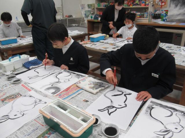 吉田佐蘭さんをお招きし、6年生が水墨画を体験しました。はじめは筆使いや墨の濃淡を教わると、基本となる竹を練習しました。竹の次には、来年の干支であるうさぎを、お手本を見ながら描きました。何度も練習し、自信がついて清書にのぞむ児童や、迷いながらも頑張って筆を進める児童、それぞれの個性がよく出たうさぎを完成させることができました。濃淡をつけることがとても楽しかった、またやってみたいと思った、といった感想が聞かれました。切り絵に引き続き、この水墨画も卒業制作の一つとなります。