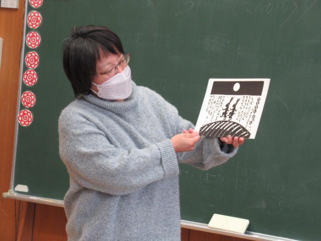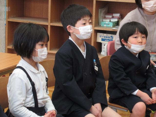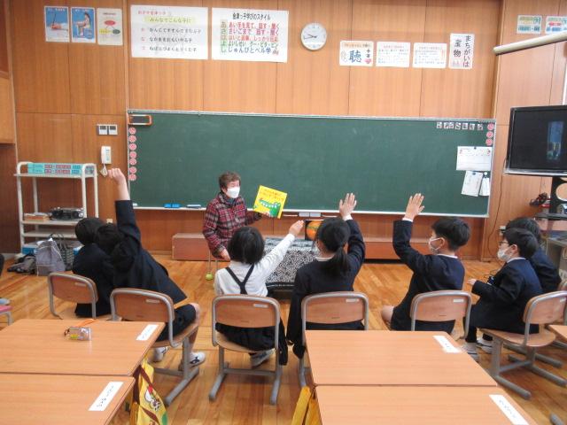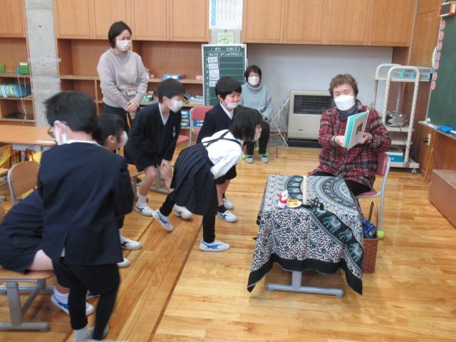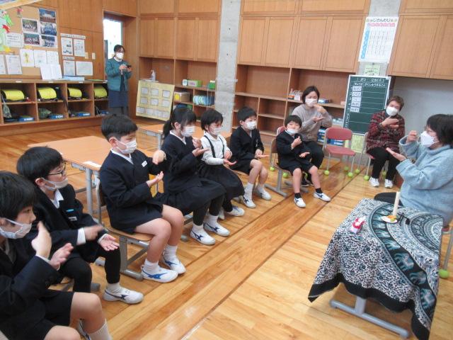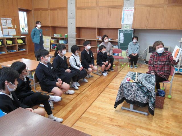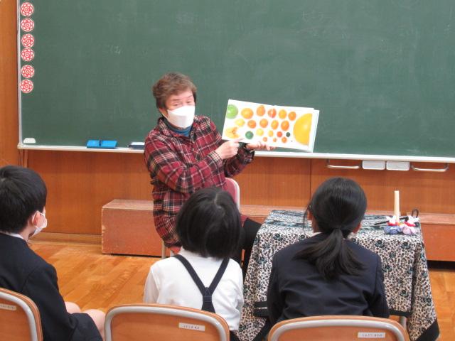 今年度最後のやまんばの会によるお話会は、1年生対象に実施していただきました。くどうなおこさんの詩「たたたん ぴょん」「いちめんのゆき」絵本「みかんのひみつ」「アランの歯はでっかいぞ こわーいぞ」手遊び「おもやのもちつき」「かれっこやいて」石川の昔話「おじじのさるたいじ」「みかんのひみつ」では、ひと房に入っている粒やたくさんのみかんの品種が実物大で描かれており、1年生は「これ食べてみたい!」「この大きいのは何て名前?」と興味津々でした。また、手を魚のカレイに見立て、焼いてしょうゆをつけて食べる、という手遊び「かれっこ焼いて」では、焼くものを何にするか問いかけると「たいやき!」「サーモン!」と、予想もしなかったものが飛び出してきて、楽しく遊ぶことができました。長山さん、髙井さん、ありがとうございました。