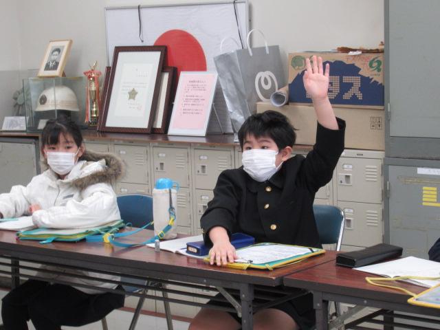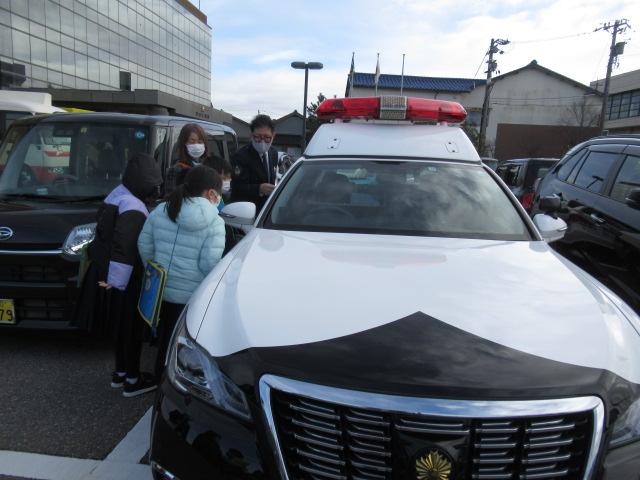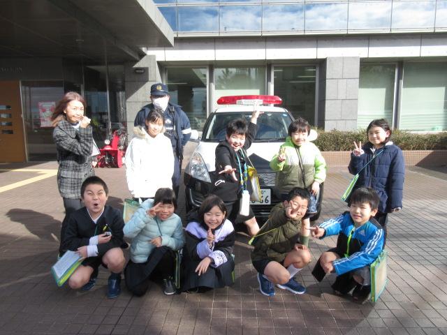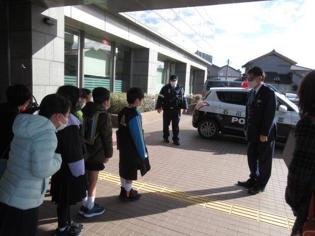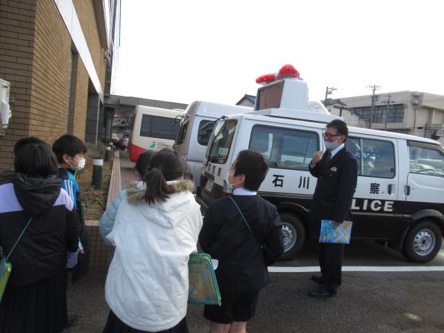 1月19日(木)、3年生が津幡警察署の見学に行ってきました。パトカーや事故処理車、留置管理課の入り口などを見せてもらいました。また、生活安全課や警務課、交通課など日常でなじみ深い課の他に警備課(機動隊)や地域課といった、子ども達があまり聞く機会のないかについても、わかりやすく説明していただきました。夜中の事件・事故に備えて警察の方々は365日24時間働いていることや、白バイは各警察署には置いておらず、羽咋と野々市にまとめてあること、つらかった子どもの事故現場についてなどお話ししていただき、子ども達が事前に準備した質問にもたくさん答えてもらいました。おみやげに反射材のステッカーやキーホルダーをいただきました。子どもたちは、よりいっそう交通安全に気を付けようと引き締まった顔になっていました。