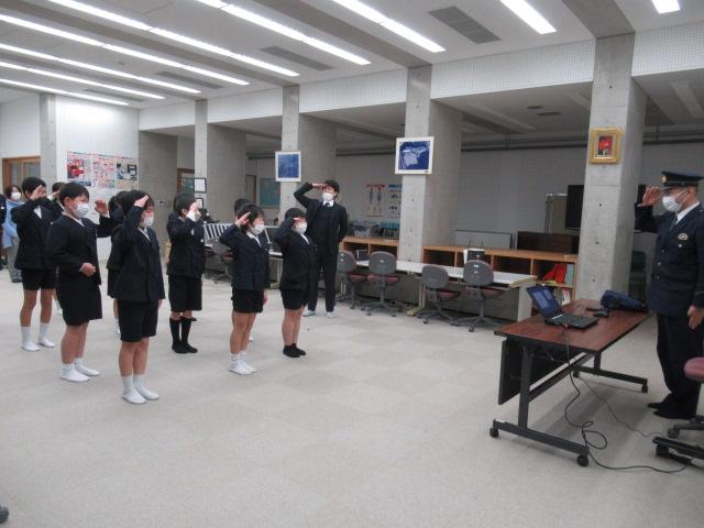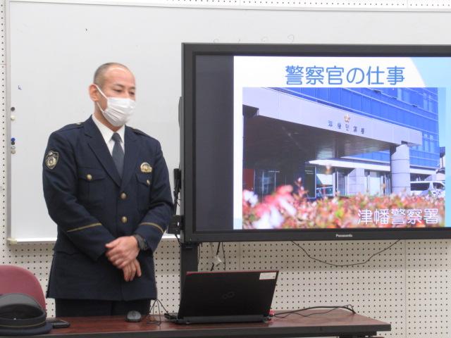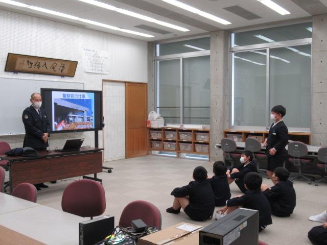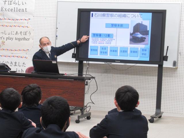 1月30日(月)、津幡警察署から杉本卓也さんに来てただき、警察官のお仕事や、警察官を目指したきっかけなどのお話をしていただきました。警察署のなかの課ごとに、それぞれどのような仕事内容なのか、また、警察署や交番で働く警察官の一日の流れなど、様々なお話を聞くことができました。命を懸ける現場に行かなければならないときは、家を出る時は家族に笑顔で出発するそうです。貴重なお話を聞くことができました。