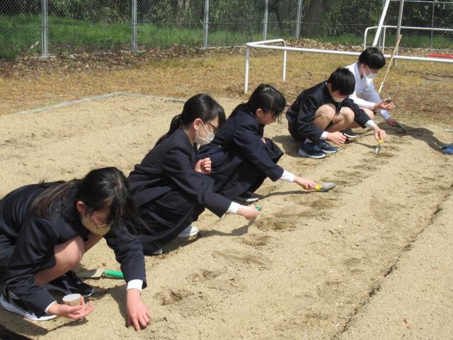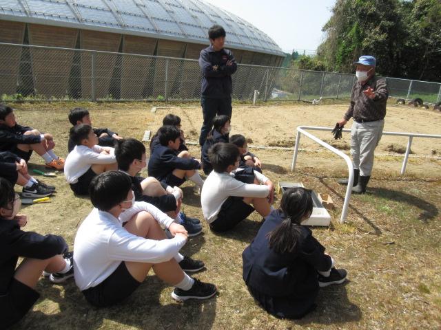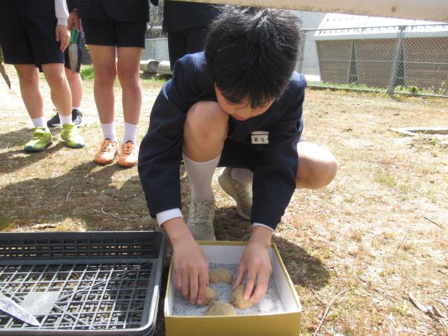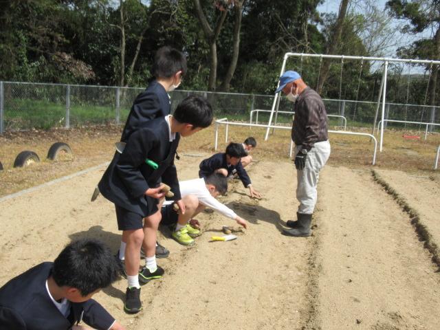 4月11日(火)、畑の先生・西東輝雄さんにご指導いただきながら、6年生がジャガイモを植えました。大きな種芋を半分に切って植える時は防腐のために断面に灰をつけること、芽が出ていたら1つか2つに「芽かき」して栄養をその芽に集中させることなどを教えていただきました。おおきく育つのが楽しみですね。