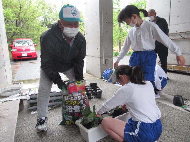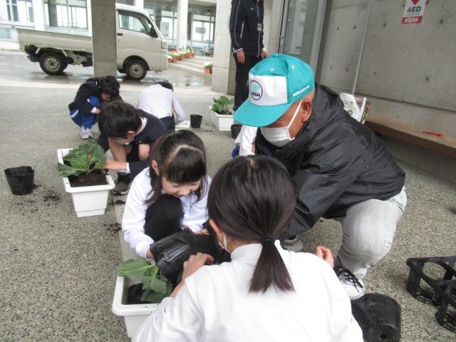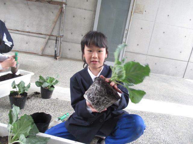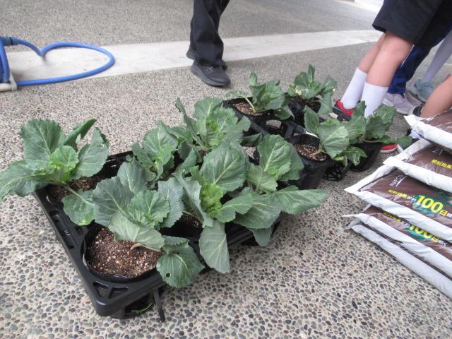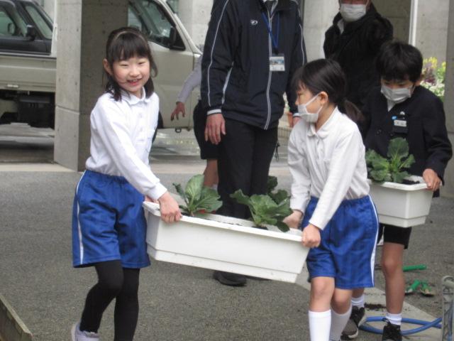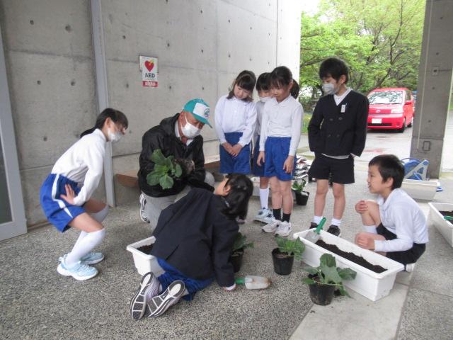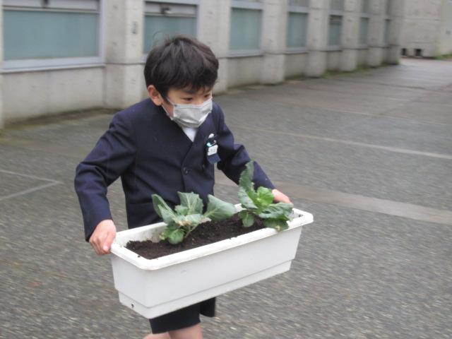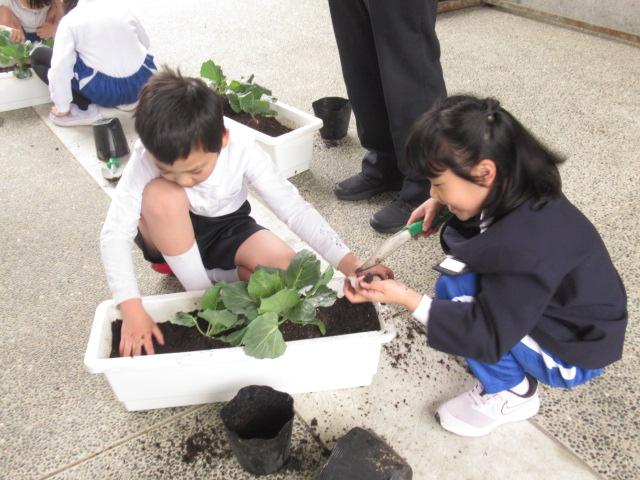 4月18日(火)、3年生がモンシロチョウの観察に使うキャベツの植え付けを行いました。キャベツの苗は、畑の先生・西東さんが冬に種から育てた苗を毎年いただいています。見たことの無い大きなポットから苗を出すときには「うまく出せるかな」と不安げだった子ども達ですが、みんな上手に取り出していました。西東さんに土を足してもらいながら、「植え方はこれでいいですか?」と自分から質問する姿も見られました。今年度もたくさんモンシロチョウが来るといいですね。