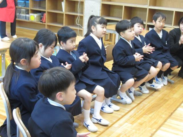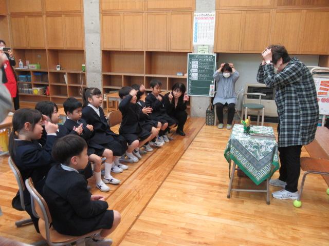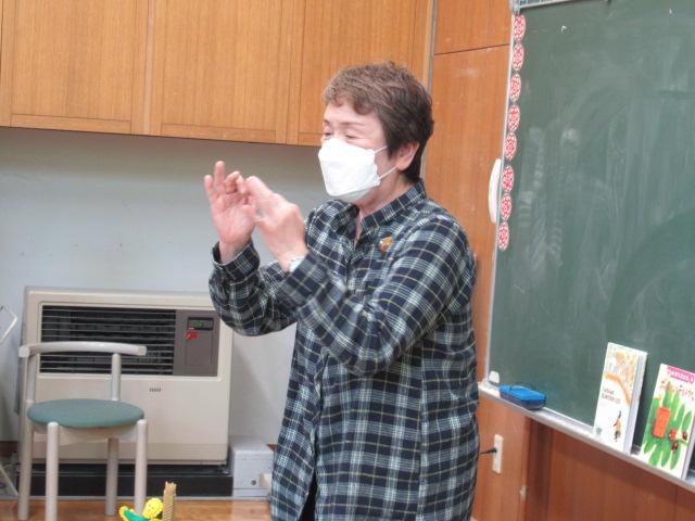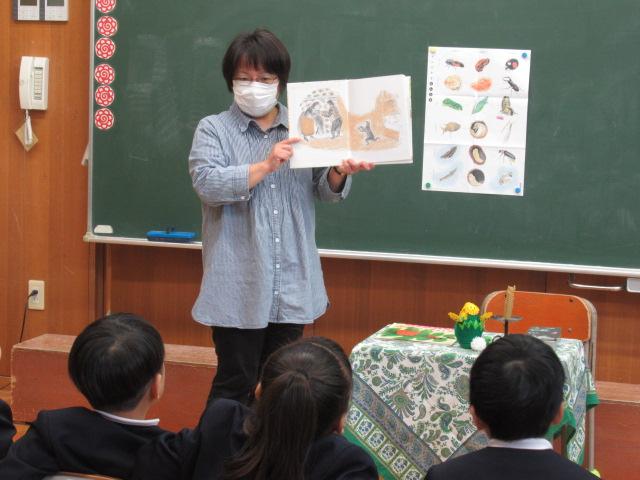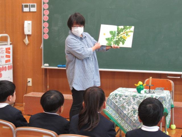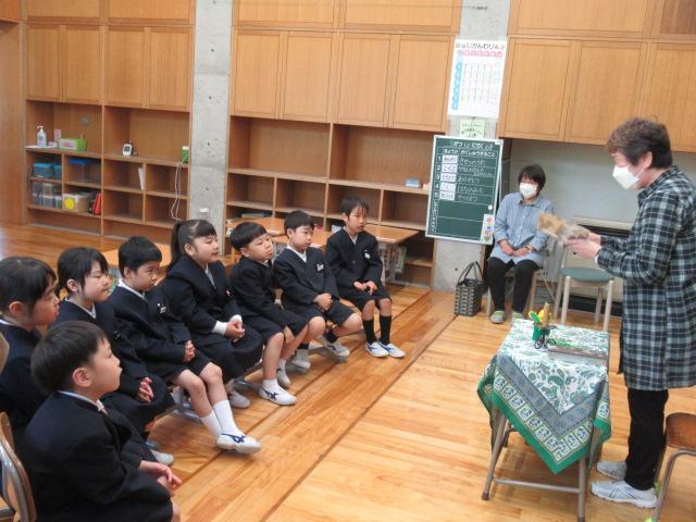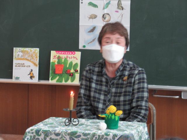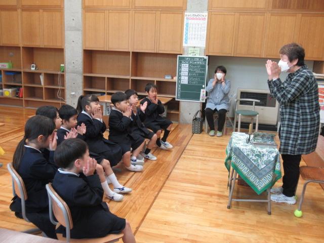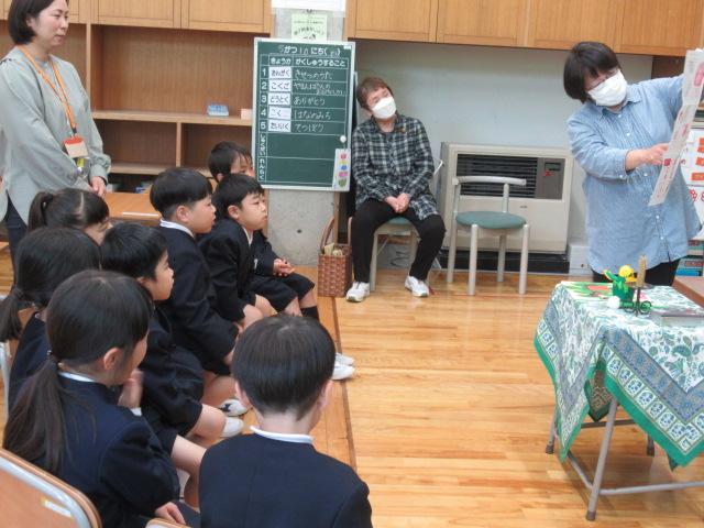 5月11日(木)、読み聞かせボランティア「やまんば」の長山康子さんと高井真弓さんに、1年生へ読み聞かせをしていただきました。手遊び たんぽぽ たんぽぽ むこうやまへ詩「たんぽぽ」絵本「ポットくんとテントウくん」「くんちゃんのはじめてのがっこう」手遊び こどもとこどもがけんかして素話「とりのみじいさ」(日本の昔話)季節に合った手遊びや絵本に子ども達は静かに聞き入っていました。手遊びは「これやったことない」と言いながら、みんなが楽しそうに取り組んでいました。「とりのみじいさ」では、最後におなかの鳥が鳴かなくなってお話が終わると、「やりすぎちゃったんだね」とすぐ内容を理解した言葉が1年生から出ていました。