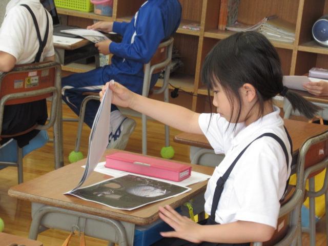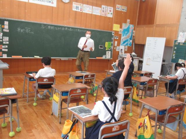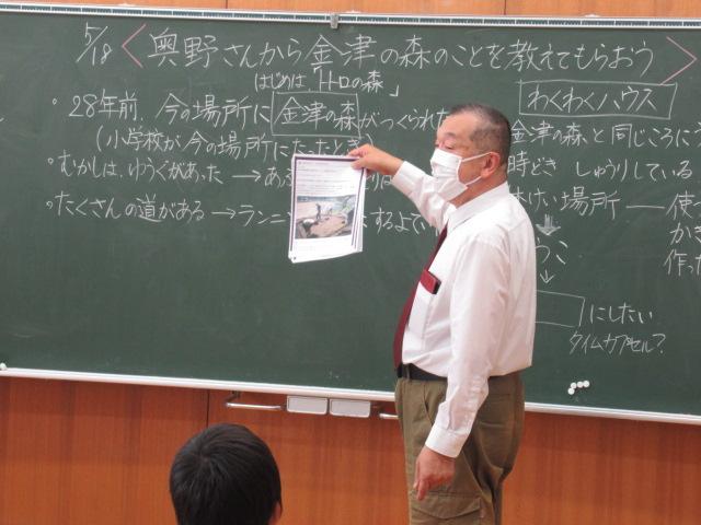 5月18日(木)、3年生が奥野清光さんに、金津の森についてお話を聞きました。奥野さんが作ってくださった資料をもとに、昔の金津の森の入り口やあずまやができる過程の写真を見て、「こんなんやったんや」と驚いていました。また、「どうして道がたくさんあるのか」「わくわくハウスは何のために作られたのか」など、子ども達のたくさんの質問に丁寧に答えていただきました。森と林の違いについても教えてもらい、一緒に外の森と林を眺めました。金津の森について、子ども達はより関心が深まったようでした。