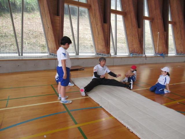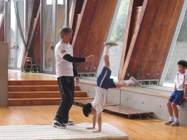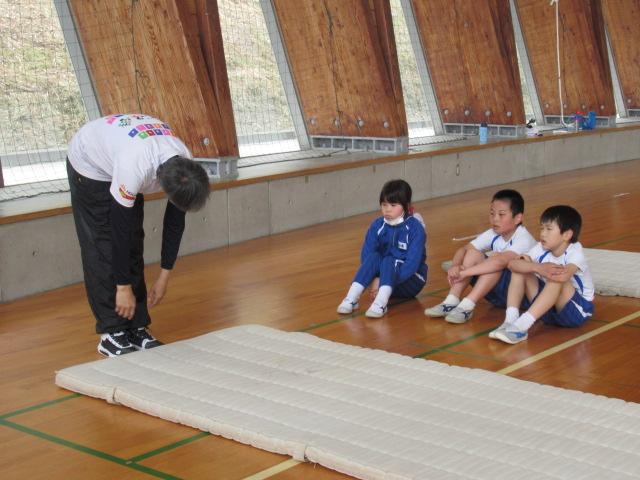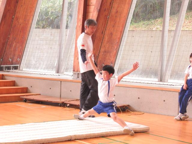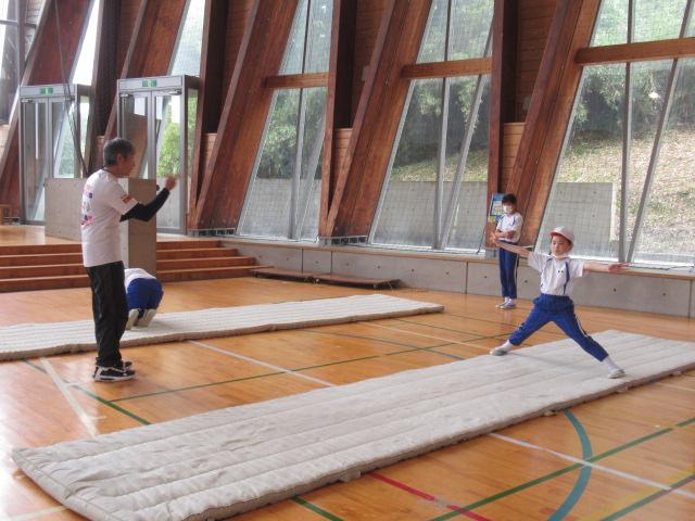 5月25日(木)、4年生が西田健一さんによる3回目の器械運動の指導を受けました。今回はマット運動を重点的に見てもらいました。倒立、側転の手や足の動かし方、開脚前転の足を開くタイミング、そして、膝を伸ばしてスタートするとかっこよく見えることなど、一人ひとりに細かくご指導をいただきました。側転の手と足をつく順番を教えてもらった児童は「なるほどー!」とうなずいていました。本番が近づき、練習も佳境に入っています。がんばれ4年生!