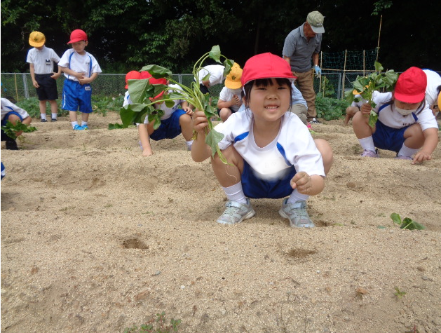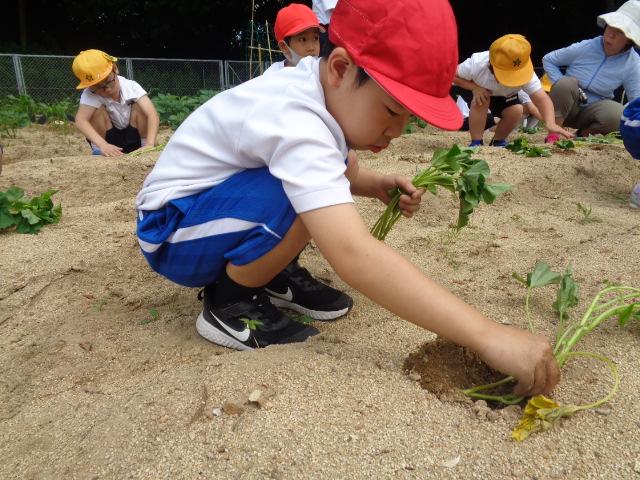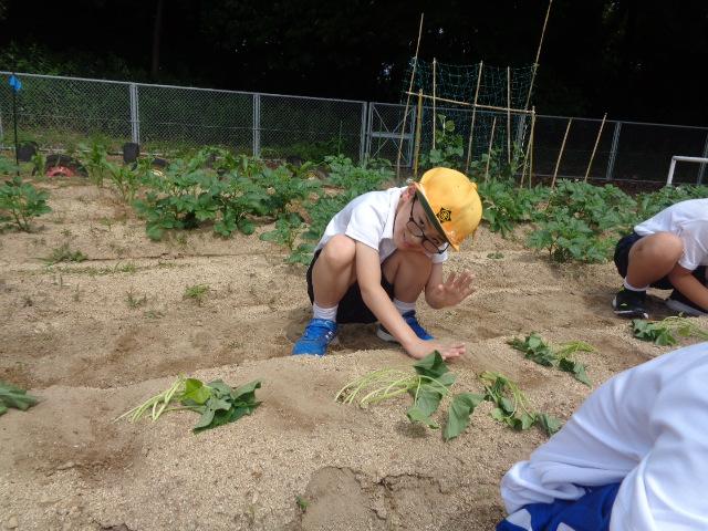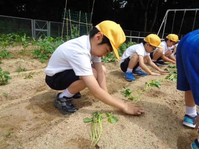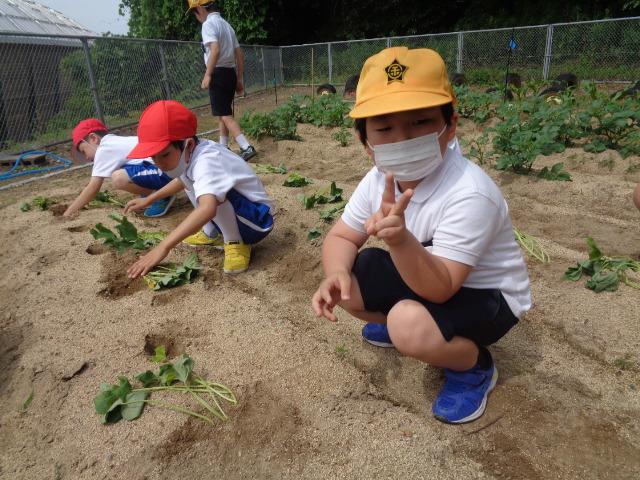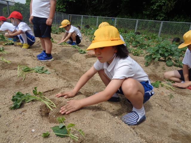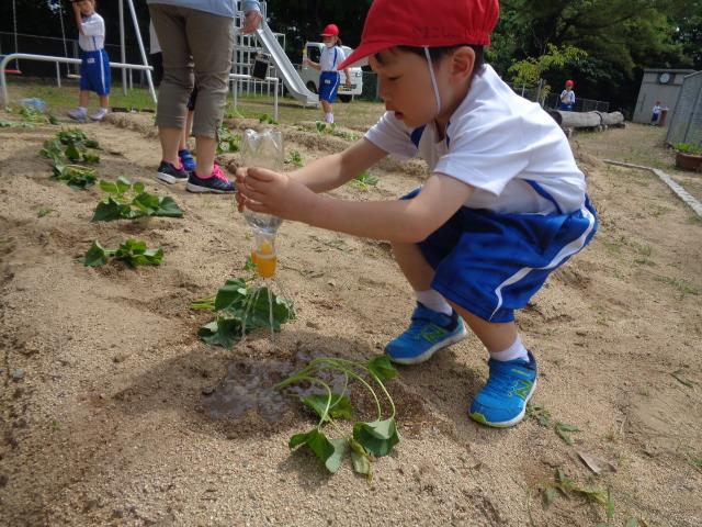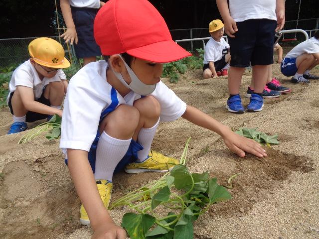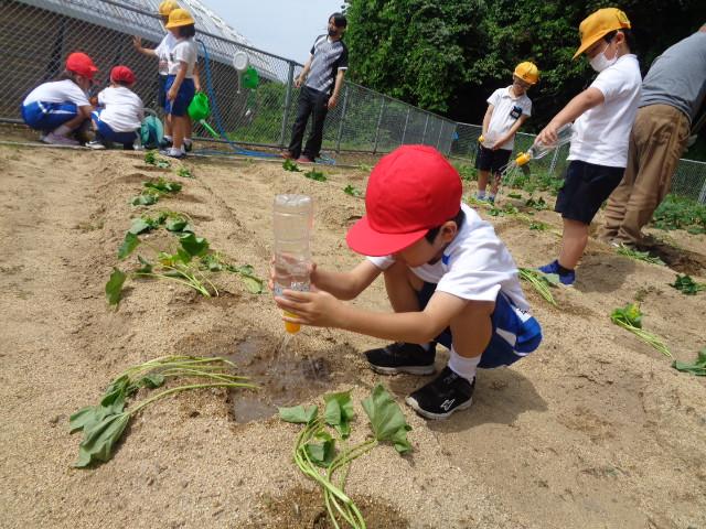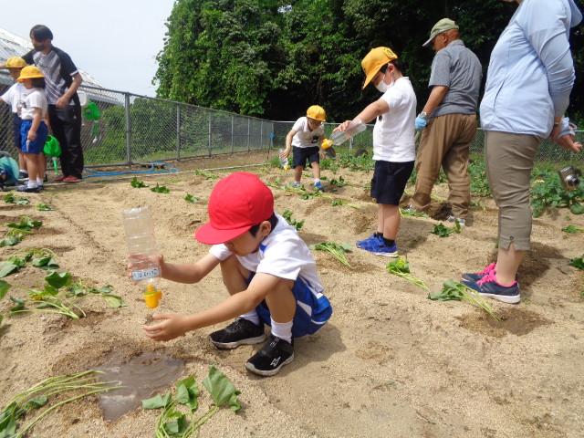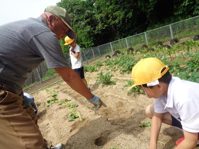 6月6日(火)、1・2年生とそよかぜ・ひまわり学級がかほっくりの苗を植えました。今回も畑の先生・西東さんに植え方を教えてもらい、一人3本の苗を植えました。さつまいもの苗は横向きに植えなければいけないと説明を受け、「なんで横向きにするんですか?」と意欲的に質問する姿が見られました。自分のペットボトルのじょうろでたっぷりお水をあげました。収穫が楽しみですね。