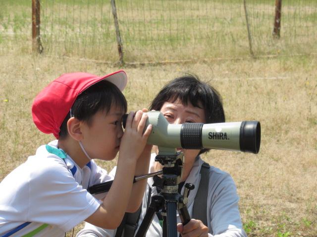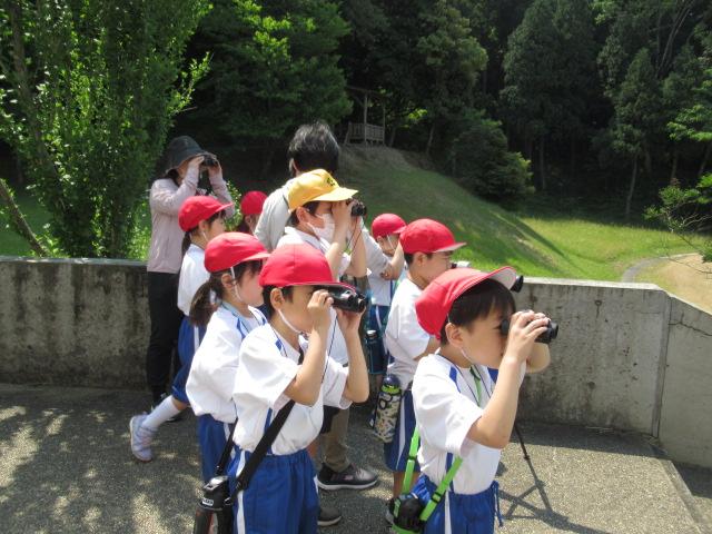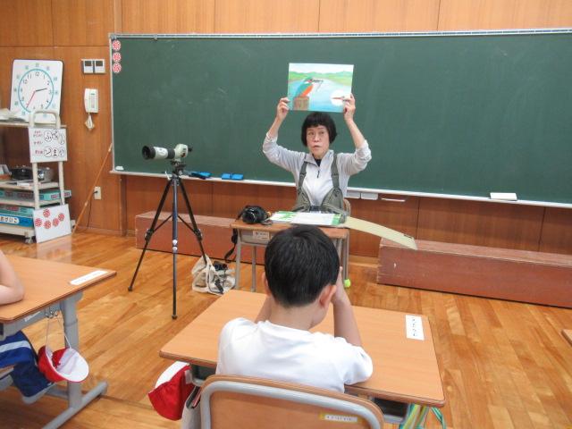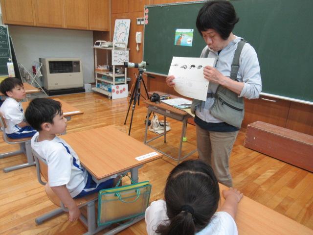 6月7日(水)、野鳥の会石川支部代表の白川郁栄先生をお招きし、1年生の国語で学ぶ「鳥のくちばし」に合わせてひまわり学級も一緒に、野鳥の観察会とくちばし講座を実施しました。白川先生によると、学校の敷地内で鳴き声だけでも15種類確認できたそうです。大きな声を出さない、近づきすぎないことを野鳥を観察する際のマナーとして教えていただき、全員が双眼鏡で一生懸命観察しました。ハシブトガラス、ハシボソガラス、ホトトギス、オオヨシキリ、ウグイス、ヒヨドリ、トビ、アオサギなど、多くの野鳥を見つけることができました。教室に戻ってからは、今日見つけることができた野鳥の特徴についてと、日本の野鳥のくちばしの特徴、形状の理由などを教えていただきました。最後はみんなでハシブトガラスの鳴きまねをしました。かわいい子ガラスがたくさんの、ほほえましい光景となりました。