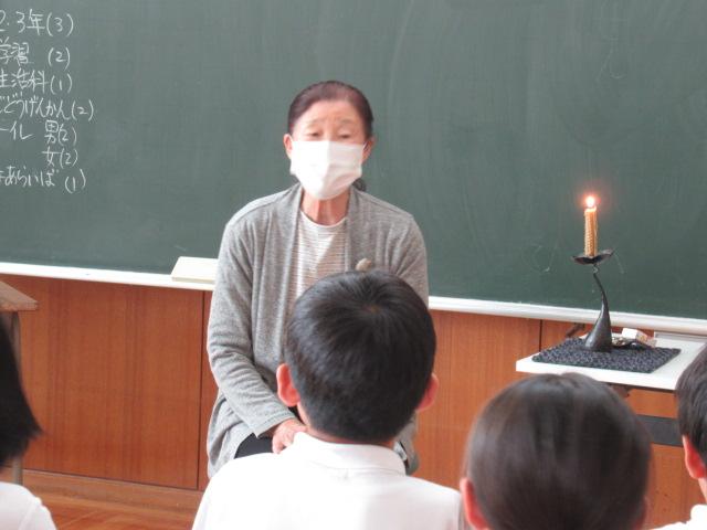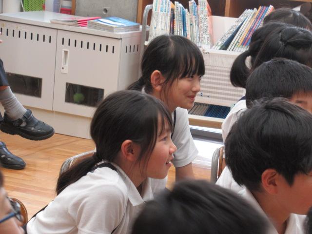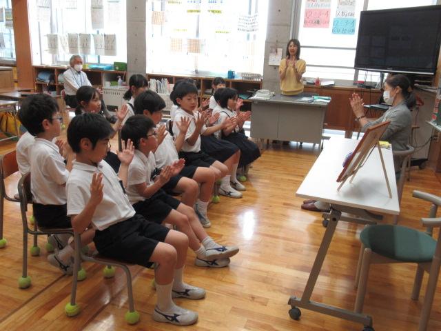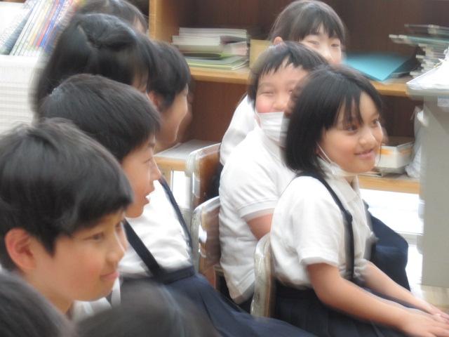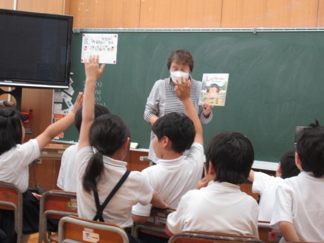 6月8日(木)、読み聞かせボランティアのやまんばさん(細川さん、高井さん)に、2・3年生を対象におはなし会が開かれました。手遊び「木がゆれる」「いもにめがでて」詩「木」「かたつむり」絵本「うまれたよ!カタツムリ」「しげちゃん」素話「王子様の耳はロバの耳」「うまれたよ!カタツムリ」では、カタツムリの赤ちゃんの生態が写真でわかりやすく紹介されていました。カタツムリは赤ちゃんの時だけ泳げることや、コンクリートを食べることに、子ども達はとても驚いていました。「王子様の耳はロバの耳」はポルトガルの昔話で、聞きなじみのある「王さまの~」とは異なり、とても新鮮で聞きごたえのあるお話しで、ラストについて子ども達は思い思いの解釈を、手を挙げて発表していました。