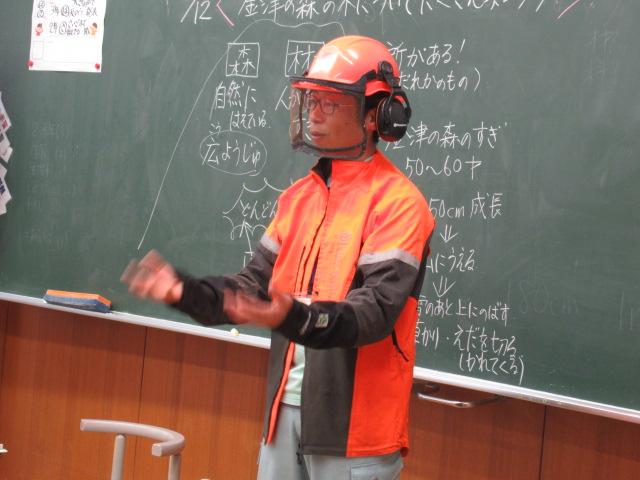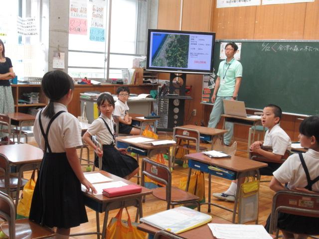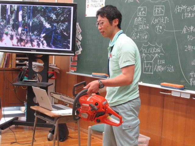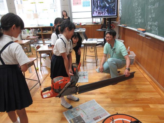 3年生は総合の授業で、金津の森についての理解を深めるために、森林組合の髙野さんを講師にお招きし、林業の観点から木の伐採の意義や森がどのように形成されているかについて学びました。 チェーンソーやドローンの実物の他、伐採時に活躍する重機の動画を見せていただき、子ども達は興味津々の様子でした。 伐採した木がどうなるのか、また、なぜ伐採するのかについて深く学ぶことができました。 今度の金津の森プロジェクトでは、実際に木の伐採の見学をします。今回の学びを胸に、より理解を深めてほしいです。