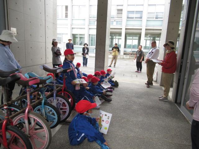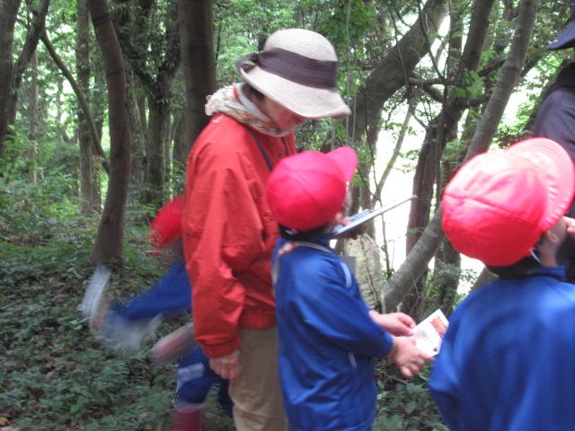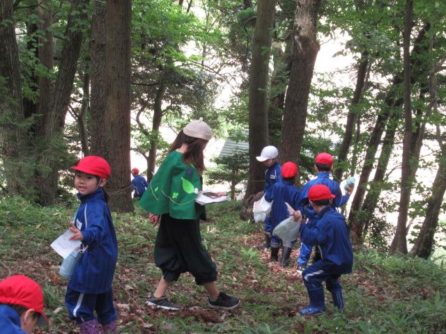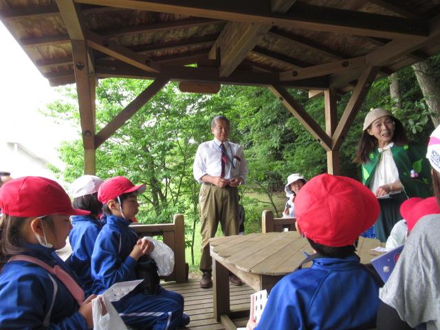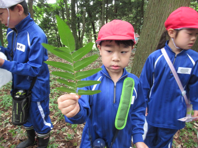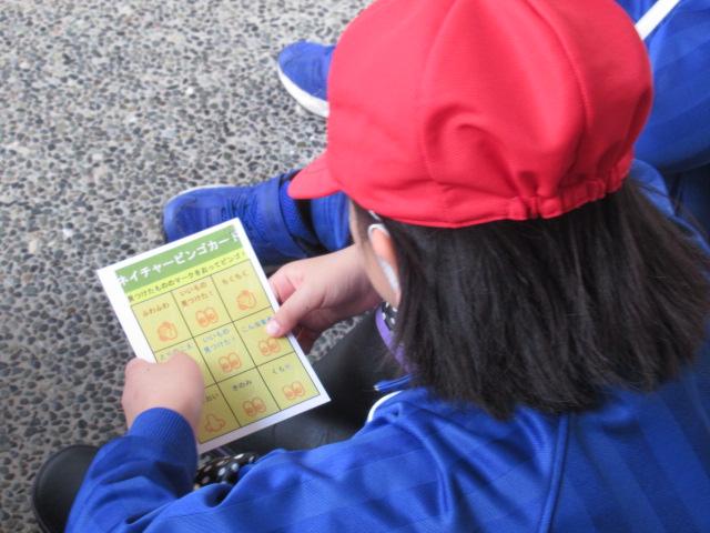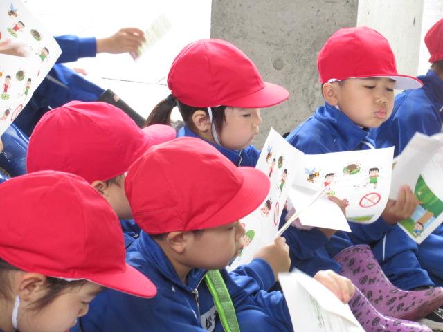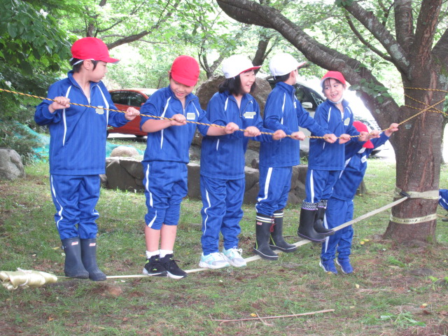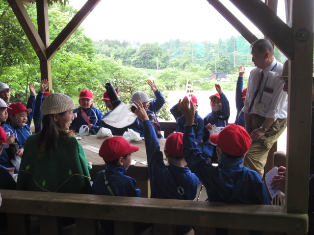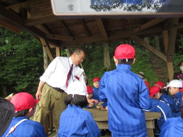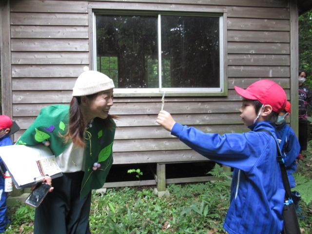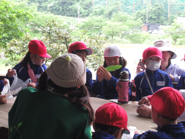 6月13日(火)、地域の方からなる「金津の森プロジェクト実行委員会」の皆さん主催で、1・2年生対象に「森となかよし」を実施しました。実行委員で司会をしてくださった村井さんは、金津の森のキャラクター「りもり(林森)」を模した手作りの衣装で盛り上げてくださいました。森の中に入る前には、安全についてのおはなしもしていただきました。金津の森の中では、「ネイチャービンゴ」という、「ざらざら」「つるつる」「あり」などを金津の森の中で探してビンゴをしました。項目の中には「いいものみつけた」というものもあり、森の中で見つけた大きなはっぱやキノコ、スギの葉、どんぐりのぼうしなど、思い思いの物を「いいもの」として集めていました。最後にはスラックラインで楽しくあそびました。