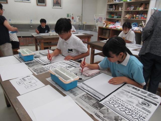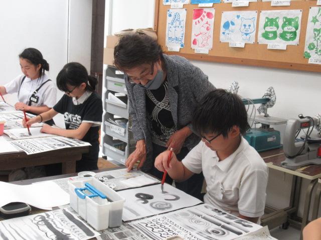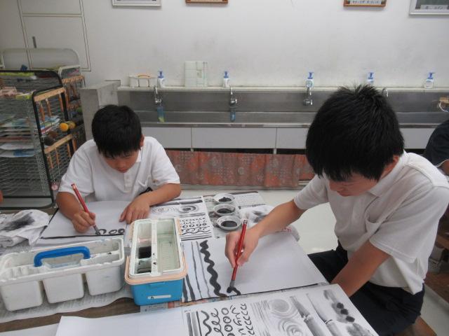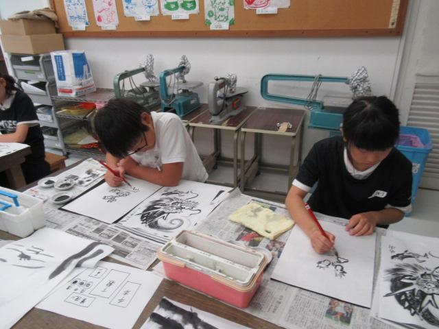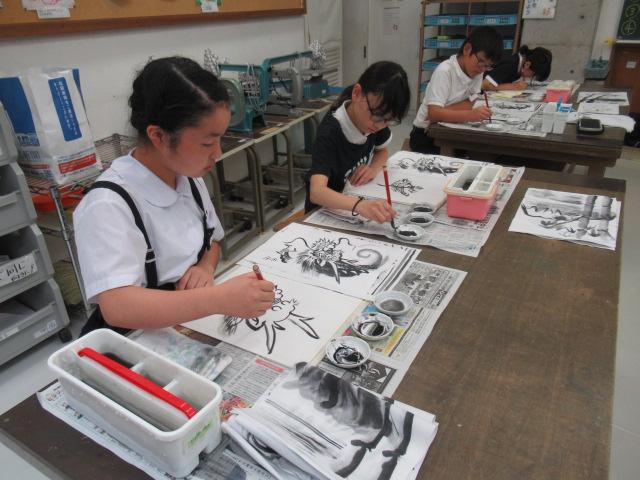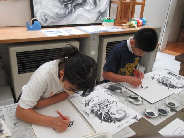 7月14日(金)、吉田佐蘭さんをお招きし、6年生が水墨画を体験しました。描くのは来年の干支の「龍」です。習字とは違う筆の使い方を教えていただきながら、まずは濃さのちがう三つの墨液の色を比べながら、かすれた表現や渦の練習をしました。思ったように線が出ずに悪戦苦闘し、練習はとても賑やかでした。しかしいざ龍を描き始めると、とても静かに取り組み、お手本を見ながら真剣に自分なりの「龍」を、全員が描き切ることができました。濃淡の付け方や龍の表情に子ども達の個性が表れた龍たちが誕生しました。
