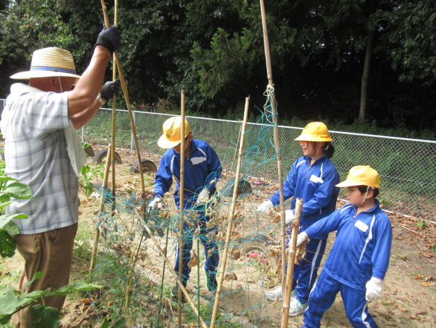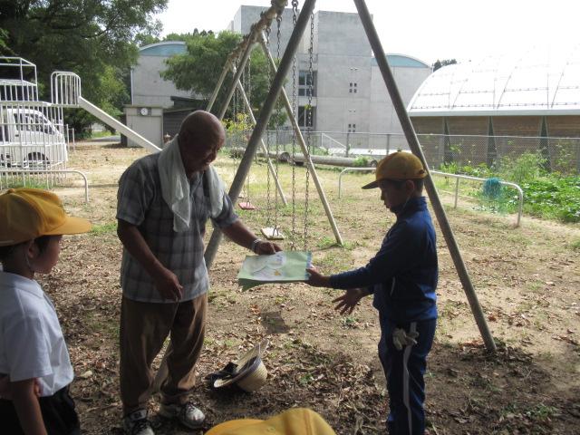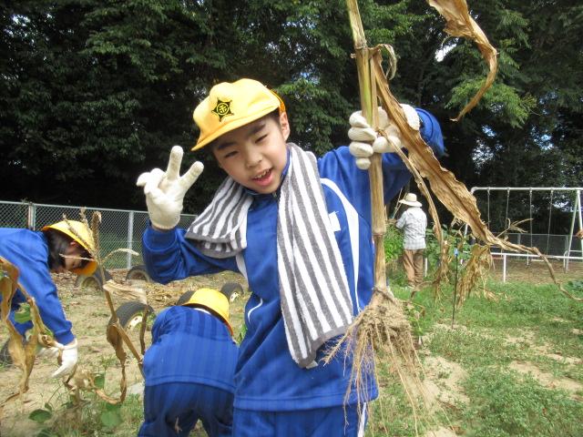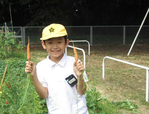 稲刈りに引き続き、畑じまいも西東さんにご指導いただきました。収穫が終わったトウモロコシ、キュウリ、ミニトマト、にんじんを片付けました。そよかぜ・ひまわり学級のにんじんはたくさん収穫できて、大満足の様子でした。大きなトウモロコシの苗を抜くときには、「うんとこしょ、どっこいしょ」と、まるで「おおきなかぶ」のワンシーンのようでした。キュウリのネットを外すときは子ども達は細かい作業に悪戦苦闘していましたが、西東さんに教えていもらいながら、丁寧に外していました。草むしりもして、畑をきれいにし、最後に、子ども達から西東さんへ感謝のお手紙を渡しました。