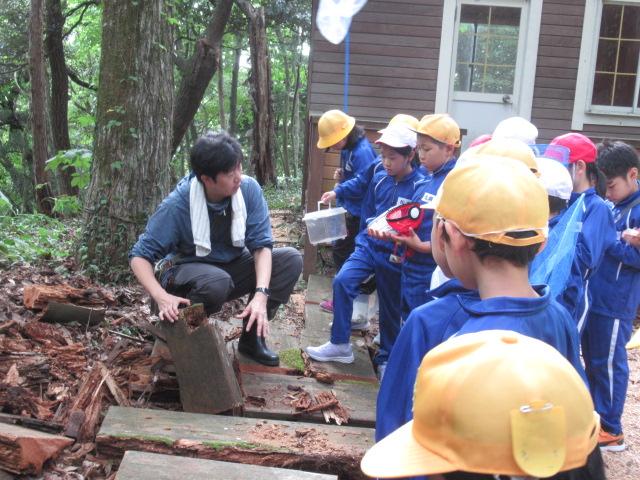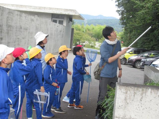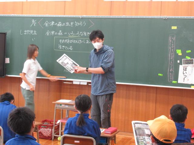 9月8日(金)、県立自然史資料館の嶋田先生をお招きし、2・3年生が金津の森に生息する虫について学びました。 はじめは嶋田先生が下調べしてくださった、金津の森に住む虫の写真と特徴、そして彼らの働きについて教えていただき、甲虫は動物のフンを食べて、シロアリは朽ちた木を食べ、それぞれが森をきれいに保ってくれていることを学びました。 後半は金津の森に入り、実際に虫を捕まえて観察しました。森に入ると、5種類のセミの声がするとのことで、みんなで耳を澄ませて聞き入りました。 また、アリやカマキリ、コガネムシなど様々な虫を見つけることができました。 虫と森の関係について、学びを深めることができました。