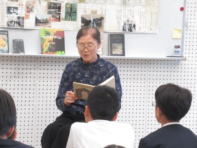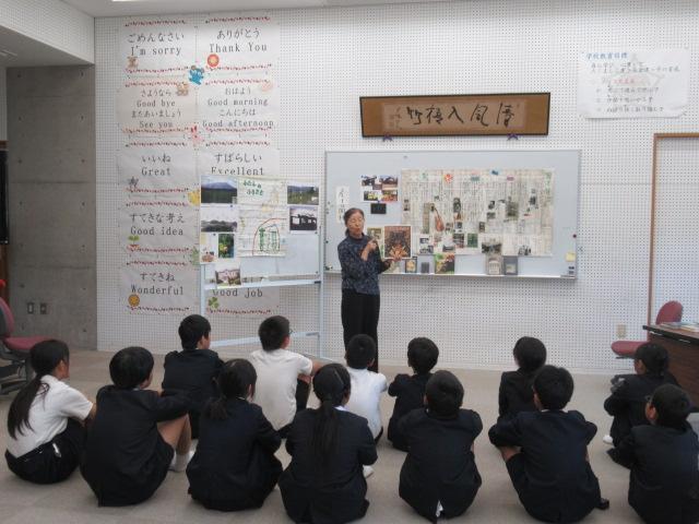 読み聞かせボランティアやまんばの細川律子さんをお招きし、宮沢賢治について学びました。6年生は国語で宮沢賢治の「やまなし」を勉強したところで、細川さんお手製の年表で、賢治が生きた時代背景と人生と、それらとの作品の関わりについて学びました。また、賢治の出身地である岩手の風景の写真も見せていただき、読んだことのある作品に関係のある風景が出てくると身を乗り出して見ていました。最後は「虔十(けんじゅう)公園林」を読み聞かせしてもらいました。6年生は、地元の農業の発展に力を注いだ賢治の人生と、木が育つことに喜びを覚える虔十の共通点を考えながら、静かに聞き入っていました。 宮沢賢治という作家と作品について、より理解を深めることができました。