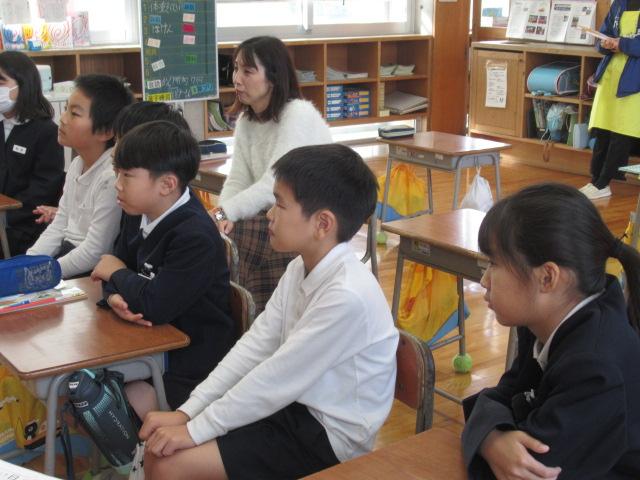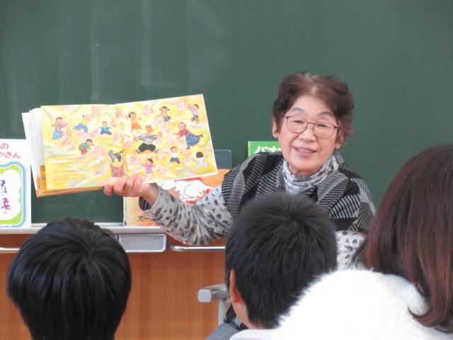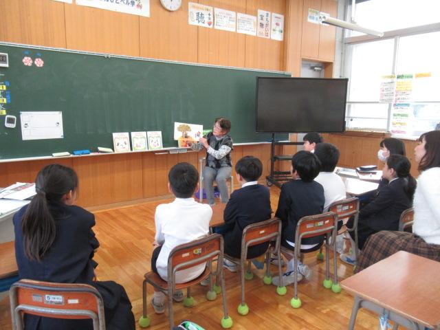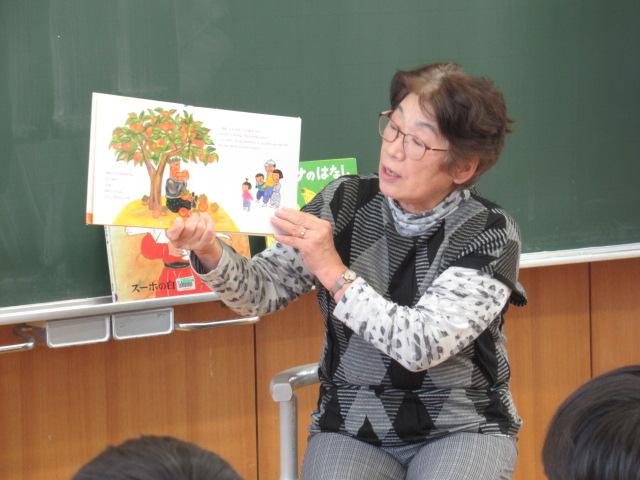 11月15日(水)、4年生が松本多美子さんに読み聞かせをしてもらいました。今回読んでいただいたのは、「ざぼんじいさんのかきのき」と「スーホの白い馬」です。欲張りな「ざぼんじいさん」と、柿のヘタや葉っぱで楽しく工夫して遊ぶ「まあばあさん」の対比のおもしろさや、やりすぎてとうとう木を切ってしまったざぼんじいさんに「あーあ」と声を上げ、子ども達はとても楽しんで聞いていました。「スーホの白い馬」では、2年生の国語で勉強したのですが、教科書では短くなっていたため、本文をすべて読み聞かせしてもらうことができました。4年生になった今、改めて聞くことで、子ども達の中で新しく感じるものがあったようでした。
