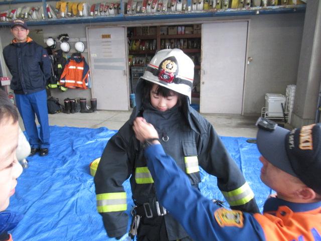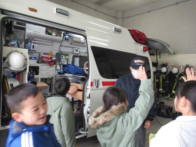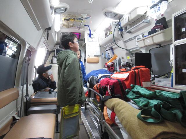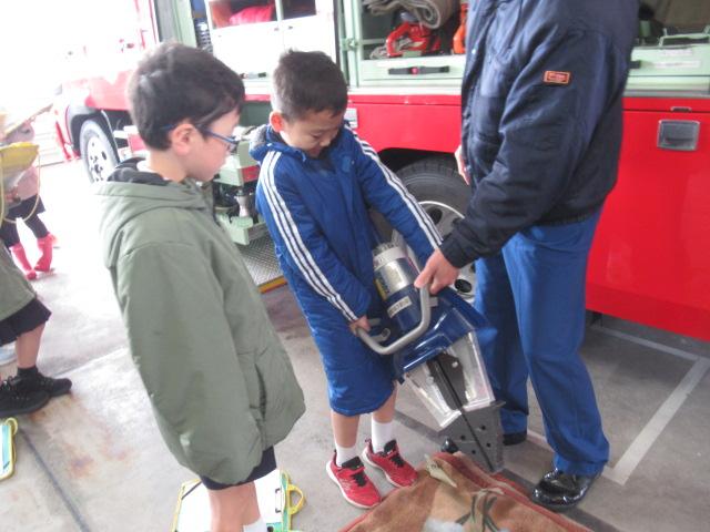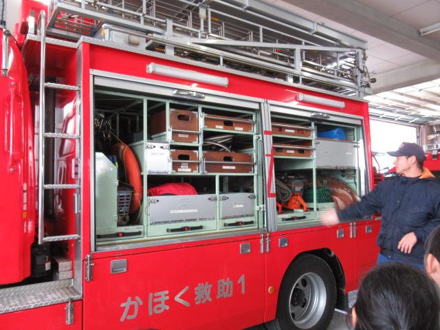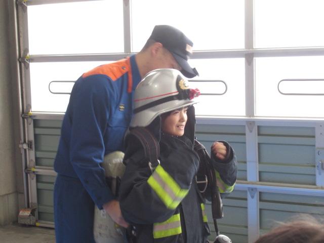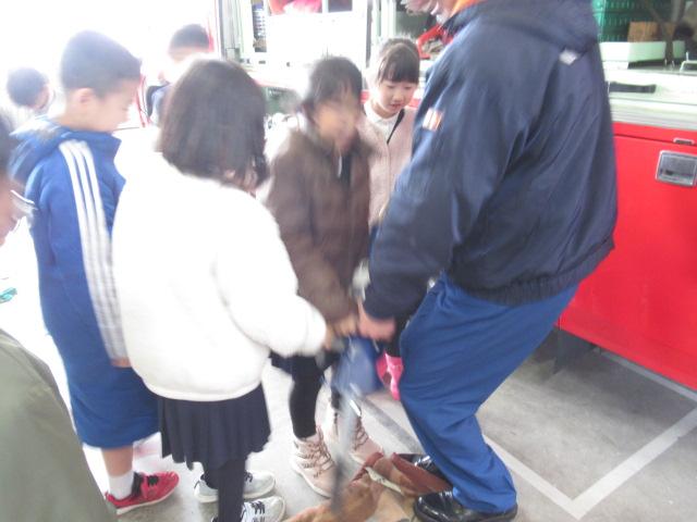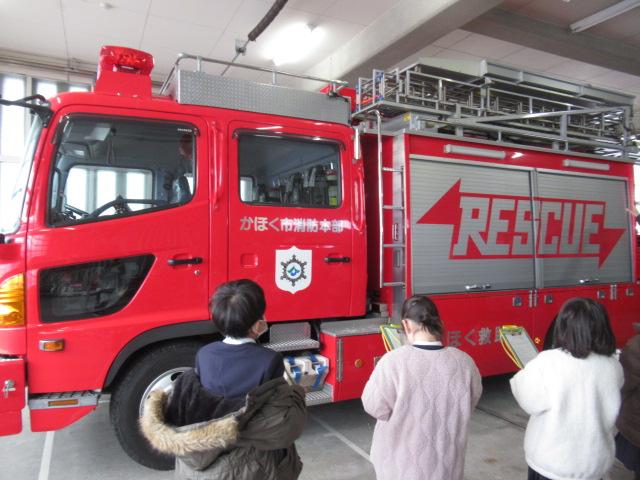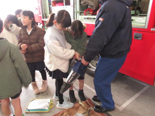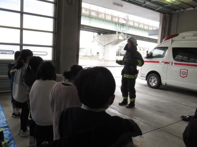 3年生がかほく市消防本部の見学に行ってきました。消防本部の組織図や火事・救急等の件数などのお話を聞いた後、防火服を着る体験をさせていただきました。全ての装備で10キロにもなる防火服を着せてもらいながら、これを1分以内に着るという消防士さんたちのすごさを実感したようでした。救急車、ポンプ車、救助工作車の中も見せてもらい、命を救うためにどれだけの物が積まれているのか、しっかりと見ることができました。