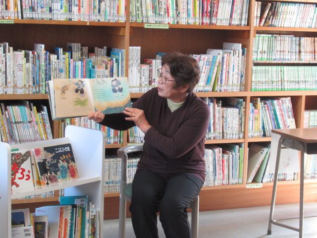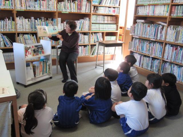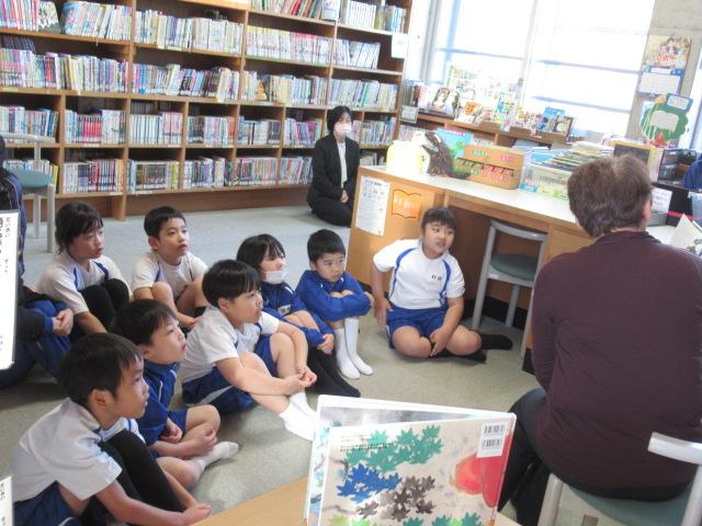 松本多美子さんに、日本の昔話を読み聞かせしてもらいました。今回読んでいただいたのは、「だいくとおにろく」と「ふるやのもり」です。1年生みんなが知らない昔話でした。「だいくとおにろく」では、作中の子守歌に鬼の名前のヒントがあることに気づく子や、最後になぜ鬼が消えたのか疑問に思う子など、様々な反応が見られました。「ふるやのもり」は、はじめは「怖い」と体を寄せ合っていた子ども達が、話が進むにつれ声をあげて笑っていました。終わってから、図書室の日本の昔話が置いてある場所を学校司書に紹介してもらうと、競うように絵本を見ていました。日本の昔話に、とても興味を持ったようでした。