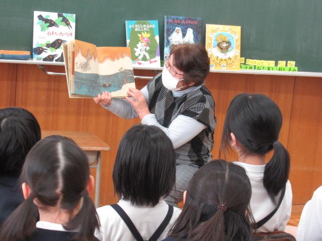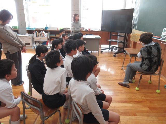 松本多美子さんに、「まーふぁのはたおりうた」と「ふくろにいれられたおとこのこ」を2・3年生が読み聞かせしていただきました。「まーふぁのはたおりうた」では、戦で死んだ恋人のために不思議な麻ではたおりをしたまーふぁが、ある晩、その輝くような美しい布に乗って恋人に再会できるというお話です。七夕にも似たお話で、子ども達は静かに聞き入っていました。「ふくろにいれられたおとこのこ」は、鬼につかまった男の子が機転を利かせて鬼を退治するフランスの民話です。ラストの熱した槍で鬼が串刺しになる場面では、思いもよらなかった結末に子ども達はとても驚いていました。