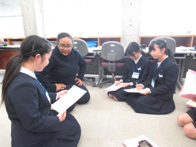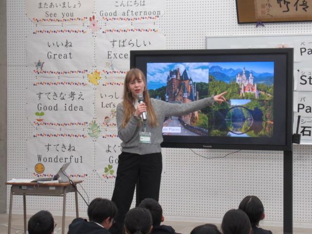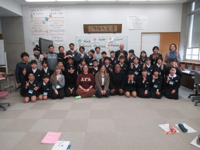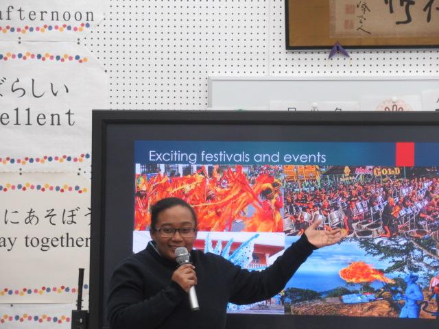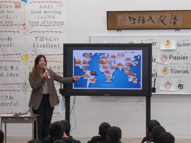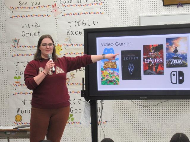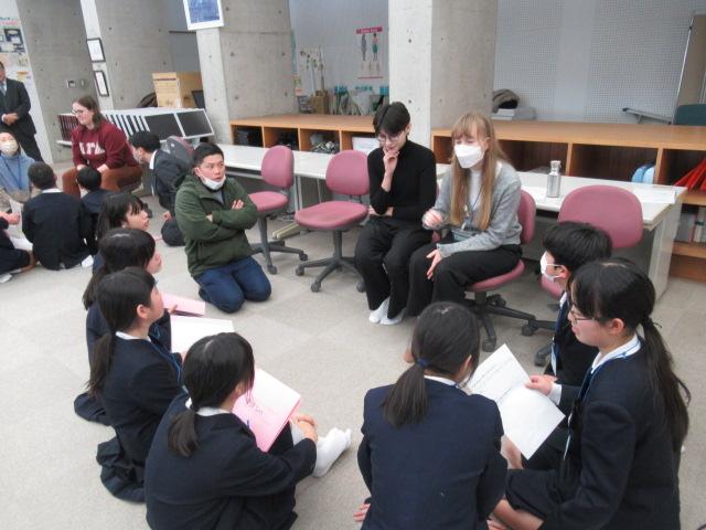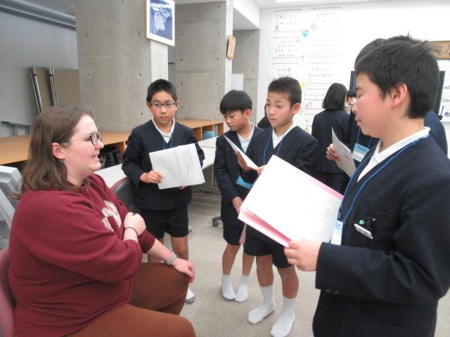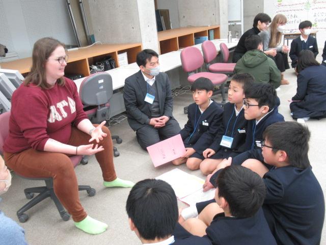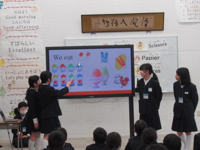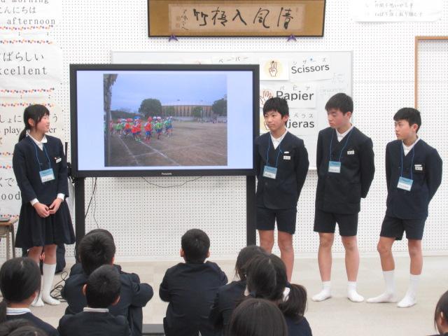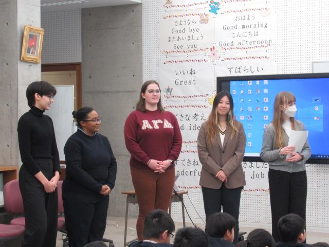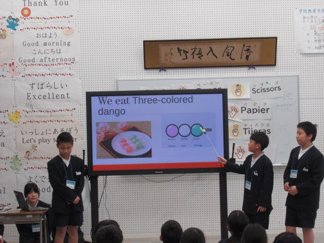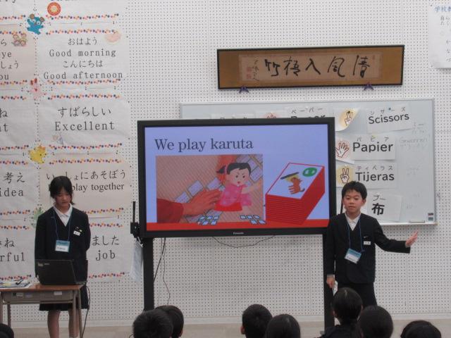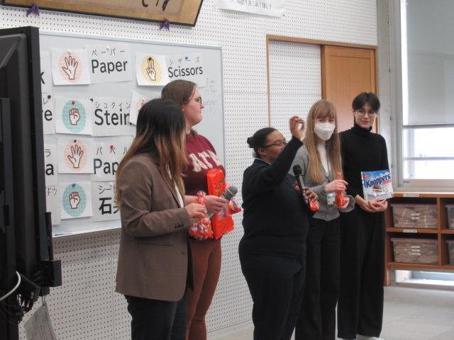 かほく市の国際交流員さんとご友人、そしてかほく市内中学校のALT(英語指導助手)の方々、合わせて5名の方にご協力いただき、5・6年生が海外の方と交流しました。アメリカ、ドイツ、トリニダード・トバゴと様々な国出身のみなさんの自己紹介に子ども達はしっかりと耳をすませつつ、ゲームや漫画が好きといった共通点には大きく反応していました。5年生は日本の四季について、6年生は小学校の思い出について英語で発表しました。緊張の様子も見られましたが、しっかりと発表できました。4つの班に分かれ、それぞれの海外の方々と交流する際には、事前に調べてきた情報や、自己紹介の時に聞いた内容を生かして質問をできており、他の国の文化や言語について、自発的に学ぶ姿勢が見られました。最後に各国のお菓子を紹介してもらい、プレゼントされ、子ども達はとても喜んでいました。