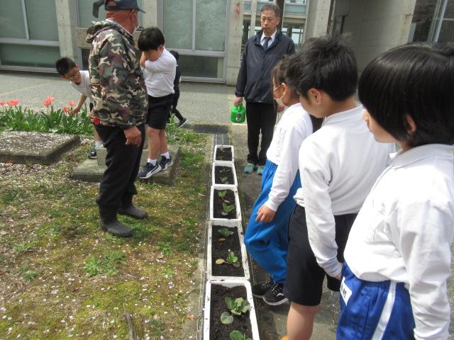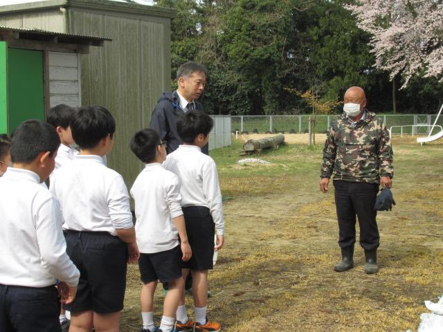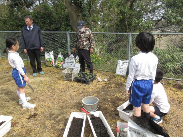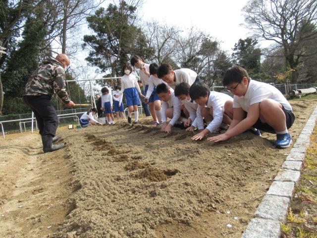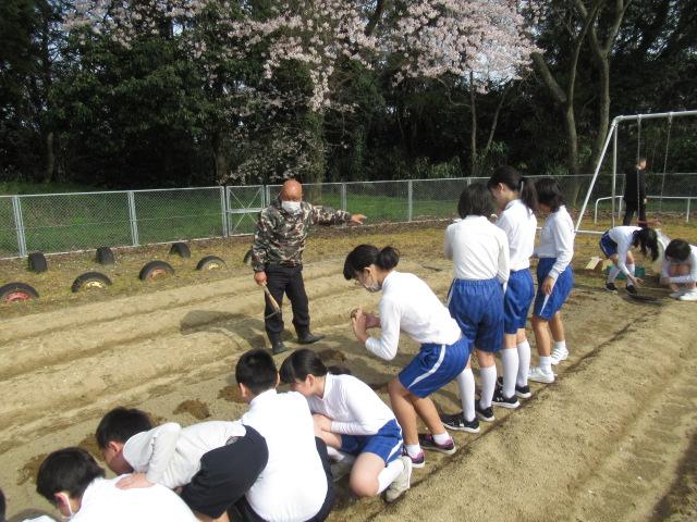 新年度が始まりました。 校舎周辺にたくさんの桜が開花しています。 今日は6年生と3年生が理科の学習のために、じゃがいもの種いもと、キャベツの苗を植えました。 植え方は、谷区にお住いの西東さんが教えてくださいました。 西東さんは、畑の畝作りや管理を毎年とても丁寧にしてくださっています。 今年度もよろしくお願いします。