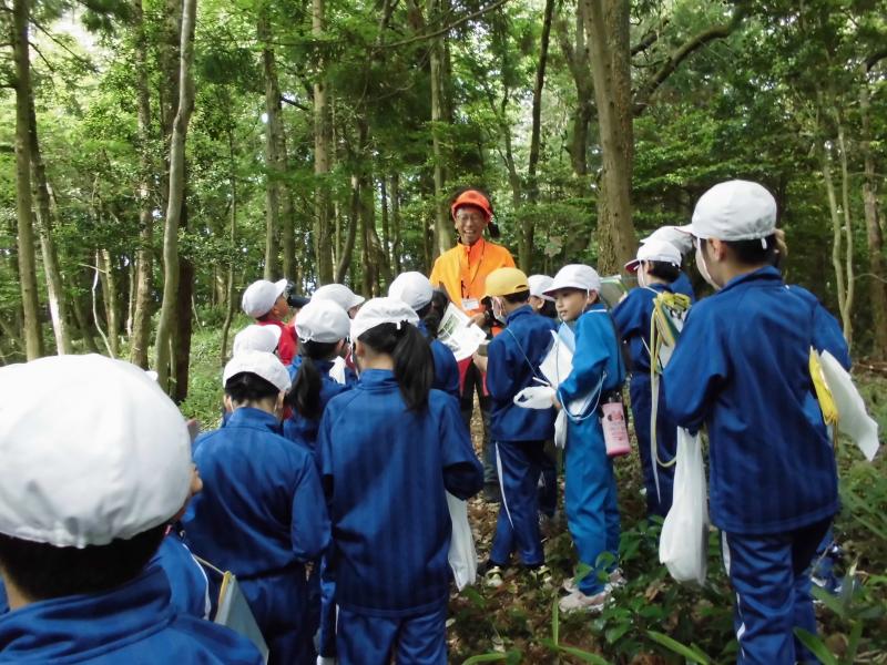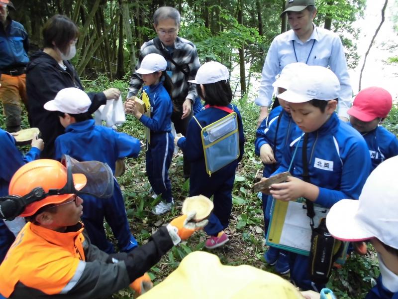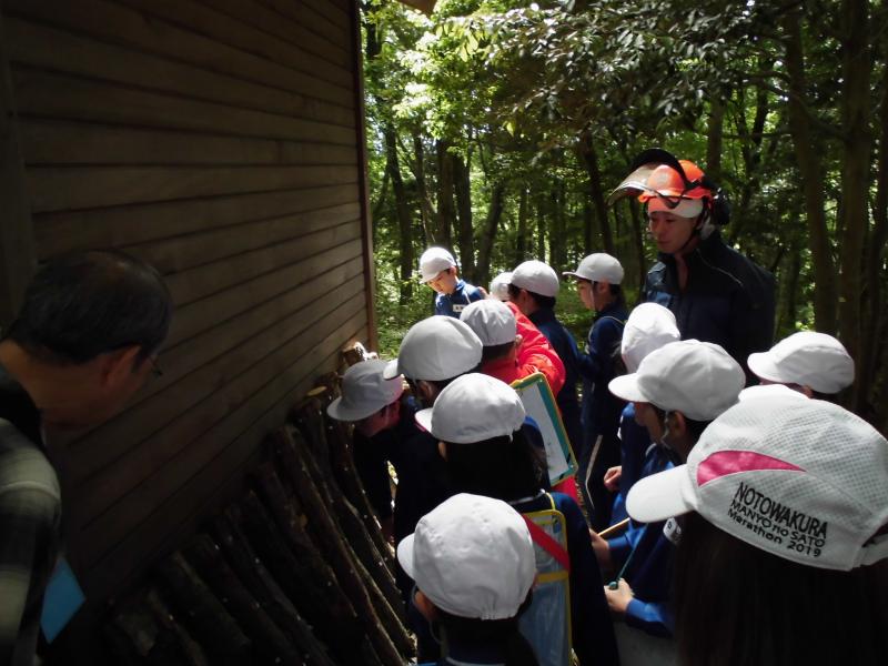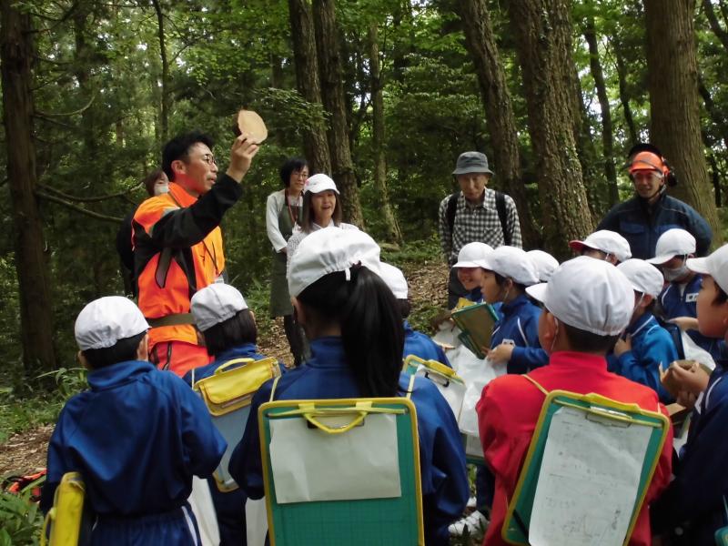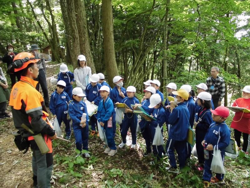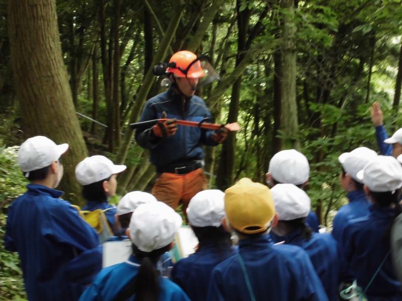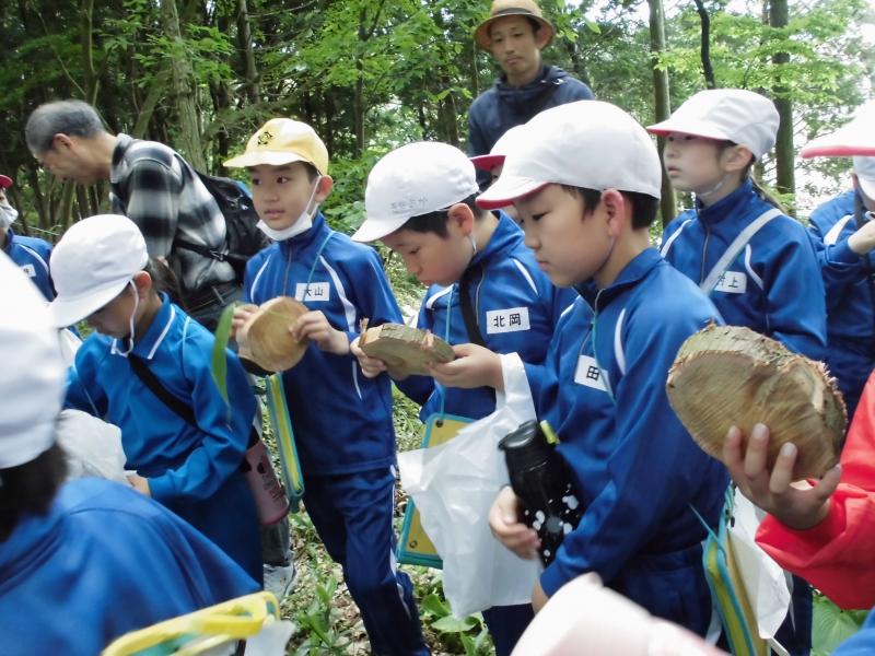 5月30日(木)に3,4年生金津の森プロジェクト「森はすごい」がありました。森林組合河北支所の皆さん、金津の森プロジェクト実行委員の皆さん、保護者の方々などの協力を得て行いました。初めにわくわくハウスまわりに置いてあるシイタケの原木の様子を観察しました。次に、木を伐採するにあたって、なぜその木を伐採するのかを考えたり、道具や服装の説明を聞いたりした後、伐採の様子を見学しました。質問タイムの後、今日の記念に缶バッチをいただきました。人の手入れが入ることで木がよりよく育つことや安全を第一に作業を進めていることなどを学ぶことができました。児童たちは、木や森林のことへ理解を深め、森林に携わる人たちの仕事についての興味を高めたようでした。ご協力ありがとうございました。
