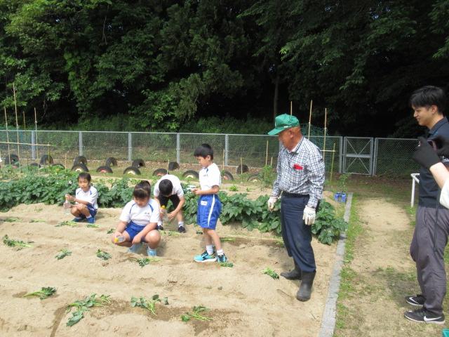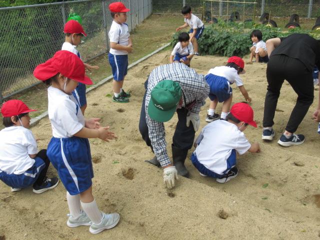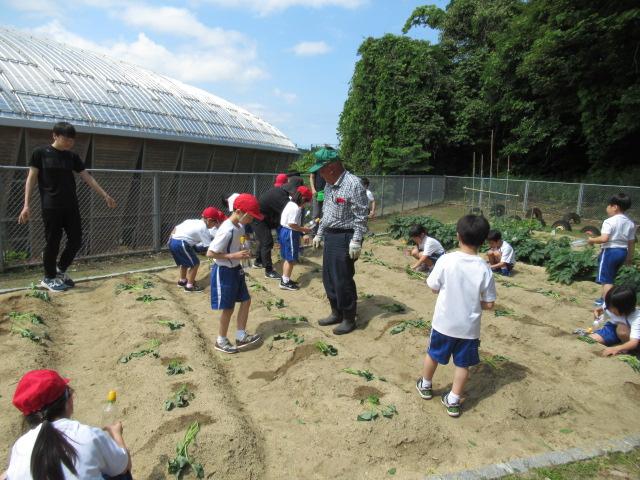 今日は畑の先生 西東さんにさつまいもの苗の植え方を教えてもらい、一人3本ずつさつまいもの苗を植えました。 事前に畝も作ってくださり、土もとてもふかふかでした。 これから水やりを頑張って、大きいさつまいもがたくさん収穫できるといいですね。