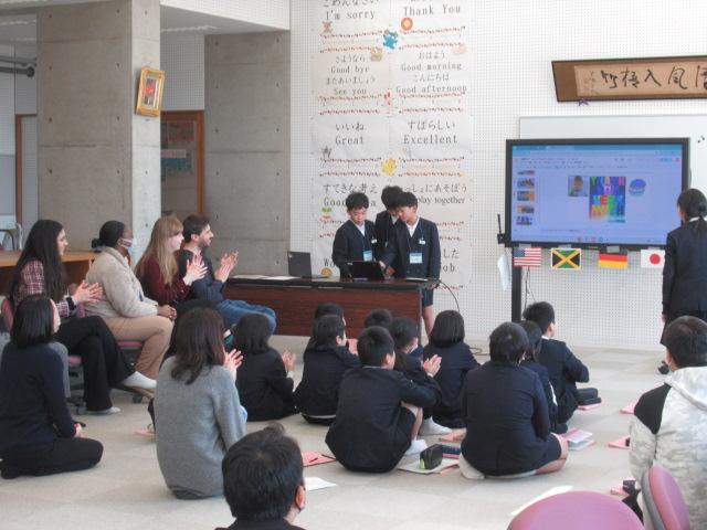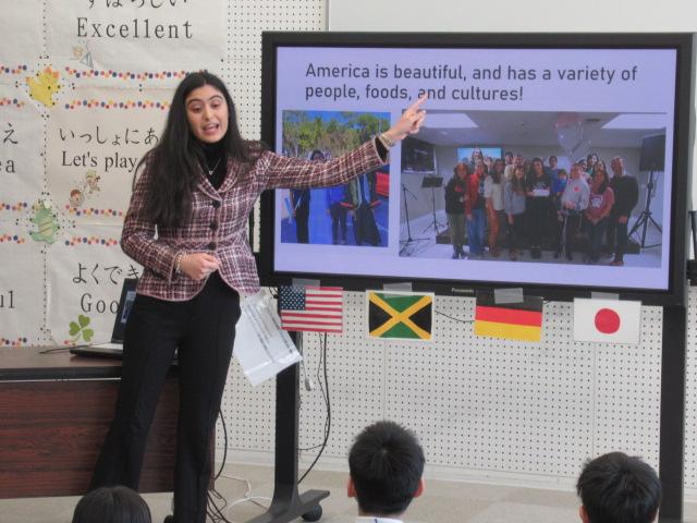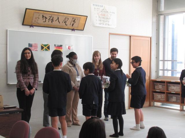 1/21(火)かほく市国際交流員のラーラさん、英語指導助手のミカエラさん、グレースさん、シャミークさんをお迎えし、いろいろな国の文化を知る機会となりました。 オープニングはロンドンブリッジから始まり、4人の先生に自己紹介をしていただきました。その後5・6年生の発表から交流タイムとなりました。途中にはいろいろな国の「じゃんけんぽん」をしたりと、終始とても楽しい時間となりました。3・4年生も見学に来て一緒に「じゃんけんぽん」もできました。 ラーラさん、ミカエラさん、グレースさん、シャミークさんありがとうございました! そしてご協力いただいた、実行委員の方々ありがとうございました。