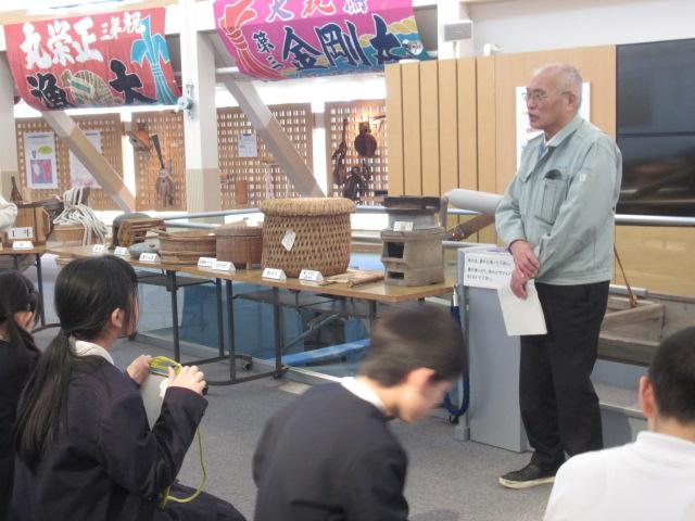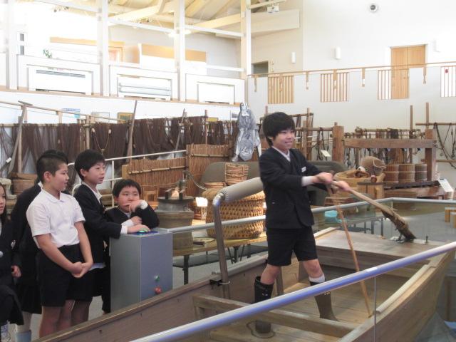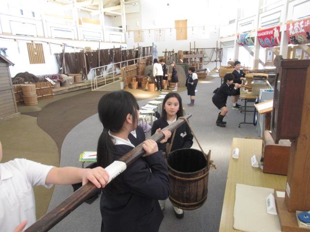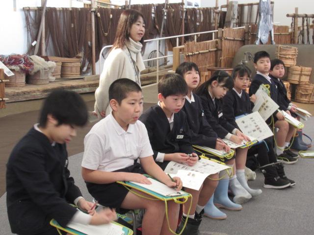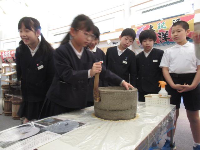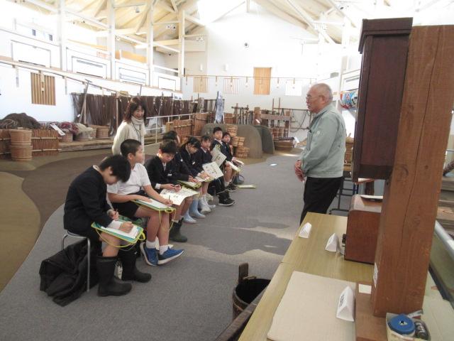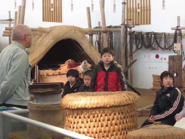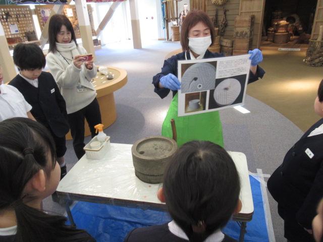3/4(火)3年生はうみっこらんどに見学に行ってきました。 この施設には昭和初期ごろのいろいろな道具や、漁が盛んだった頃の七塚地区の船の模型が展示してあったりとタイムスリップしたような雰囲気の施設でした。そしてその時代は、井戸に水を汲みに行くのは子どもの仕事だったと聞くと「何回も往復しんなん!」「ここにも水が必要!」と、3年生はびっくりしていました。石臼で豆も挽かせてもらい、五感でいろいろなことを感じれたのではないかと思います。今の生活が当たり前になっている私たちも「この時代の生活は体力がいるな」と感じることができました。