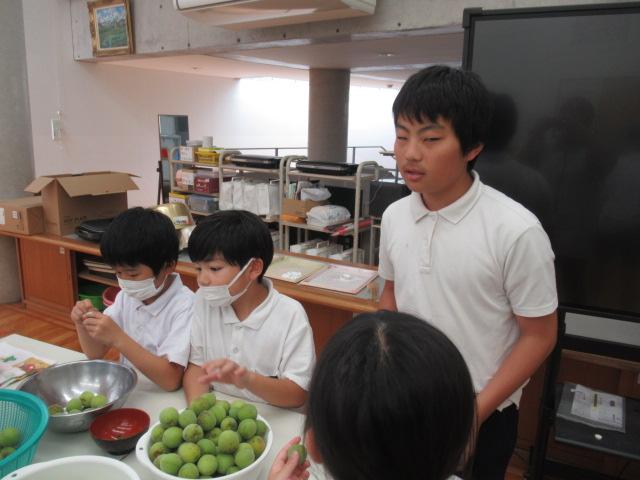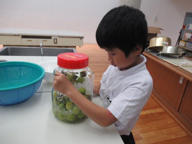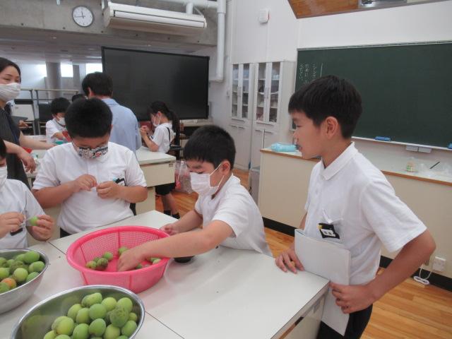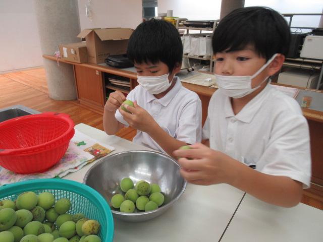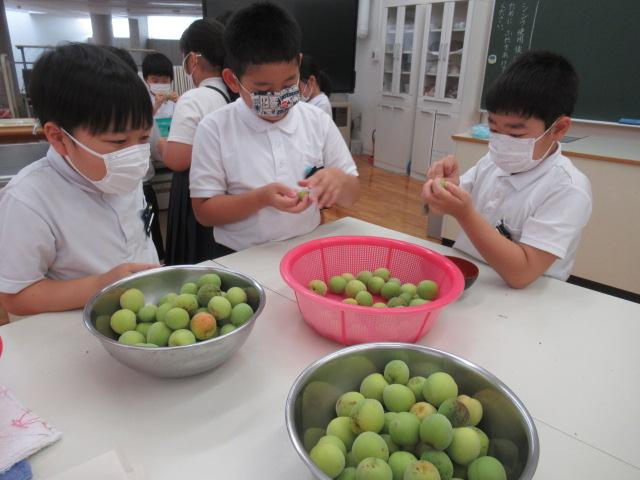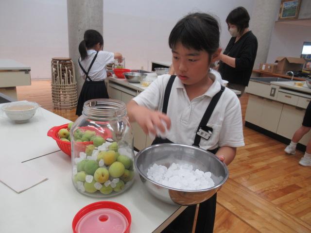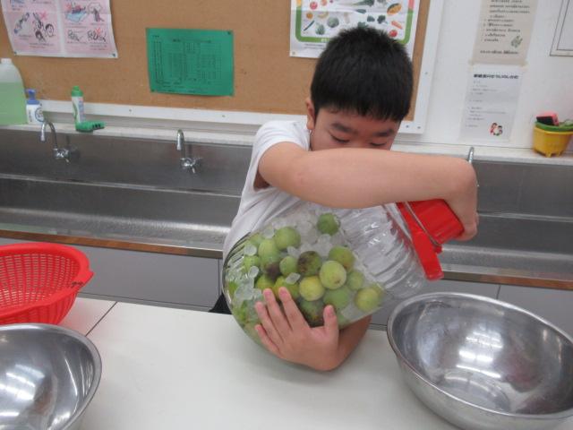 6/23(月)~25(水)まで3年生は梅シロップ作りをしました。 校舎横に実っている梅を収穫し、ヘタを取り除き洗い一つ一つ優しく丁寧に拭き、氷砂糖とりんご酢で瓶に漬け込みました。3年生はこれからしばらくおいしいシロップが上がってくるように、毎日瓶を優しく回していきます。 出来上がったシロップは全校児童、保護者、地域の皆様で味わえたらと考えています。