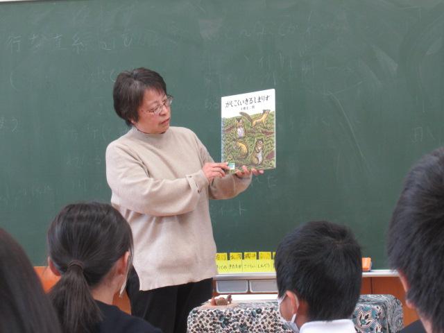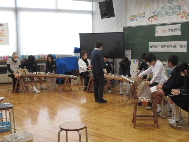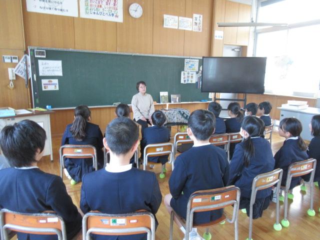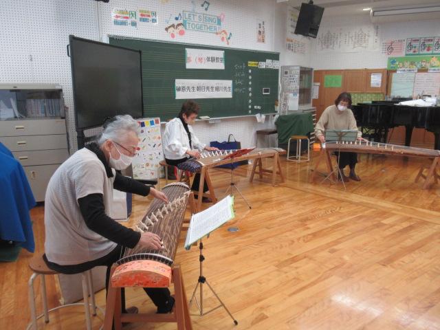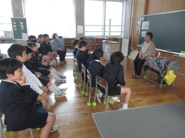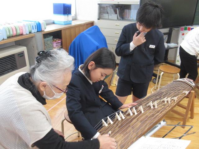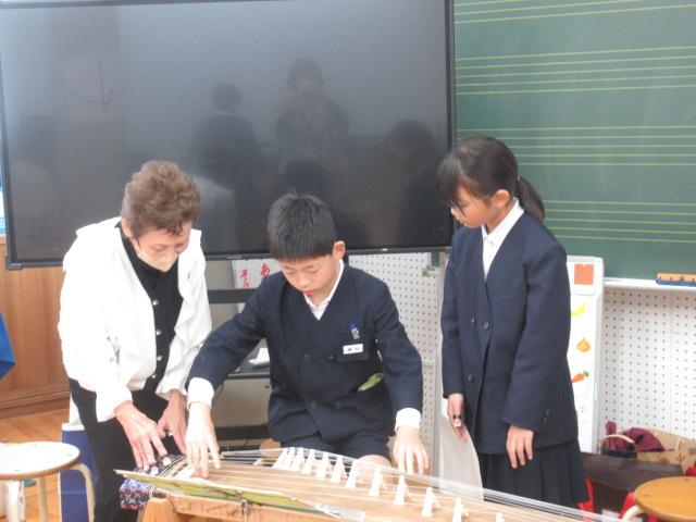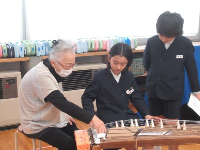 11/13(木)、1限目にやまんばさんのお話し会がありました。手遊びと絵本を2冊読んでくださり、最後には輪島市総持寺に昔から伝わる「みそすり地蔵」の民話を聞かせてくださいました。 そして2~3限はお箏体験でした。お箏の榊原先生に講師をお願いし、4年生は昨年も体験しているので最後には「さくら」を全員が弾けるようになりました。