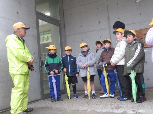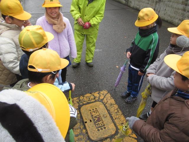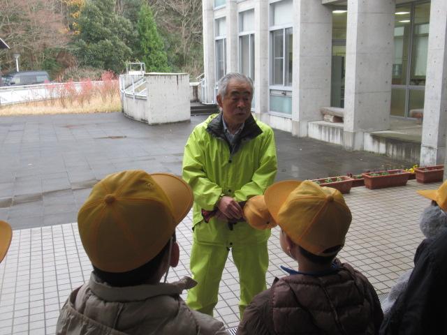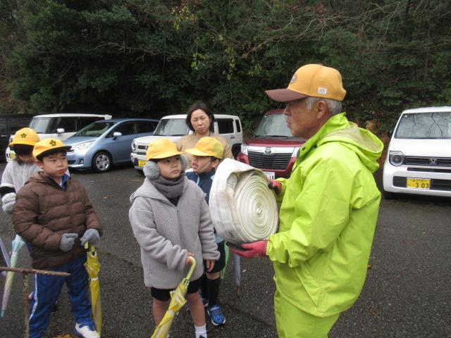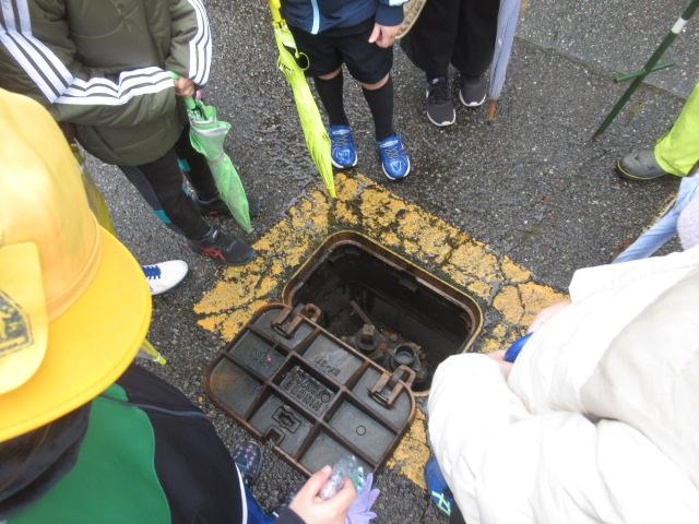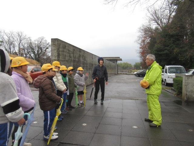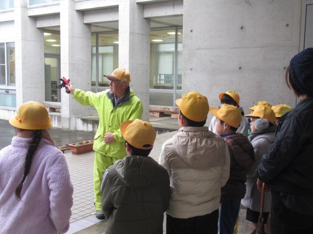 12/8㈪ 3年生が社会の時間に、上田名区の奥野司郎さんを講師にお迎えし、「学校の消火栓について」「もし学校が火事になったらどうやって消火する?」などお話しをうかがいました。まず最初に学校のプール横にある消火栓で実際に蓋をあけてもらい、中がどうなっているか、どうやって水が出てホースに繋ぐかなどお話ししてくださいました。その後玄関に移動し、もし学校が火事になったらどこに消防車が来て、水をどこから引っ張るかなど話してくださいました。最後の質問では、「今までの火事の中で、一番消火に時間がかかったのは?」など熱心な質問があり、奥野さんもわかりやすくとても丁寧に答えてくださいました。また奥野さんからは「今日、おうちに帰ったら学校で消火栓や火事の話をしたよ。うちでも火事に気をつけようね。と話してください」と火事への注意がありました。 寒い中、ありがとうございました。
