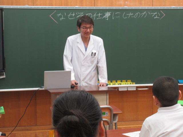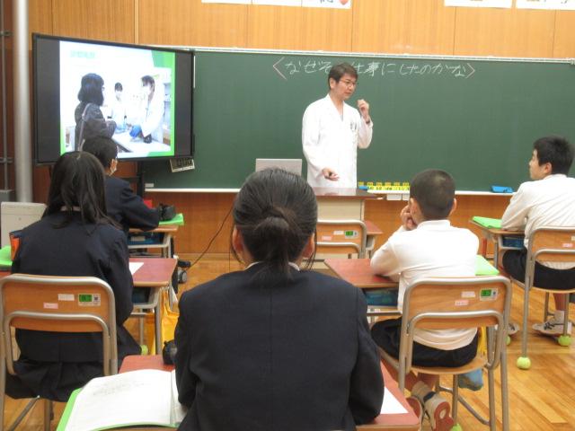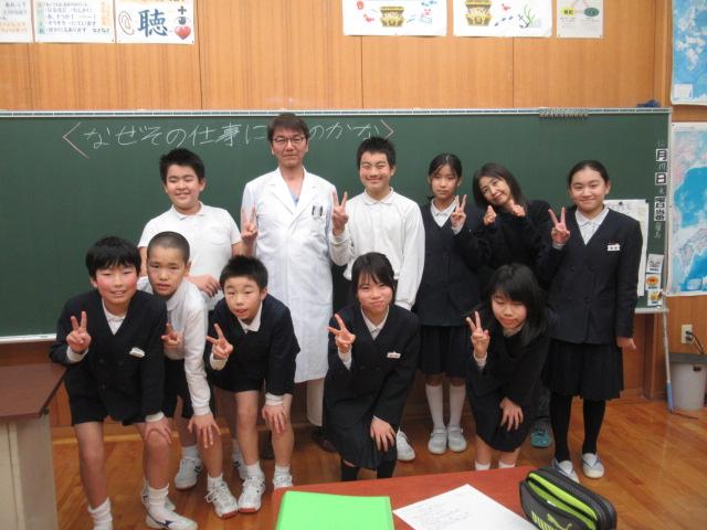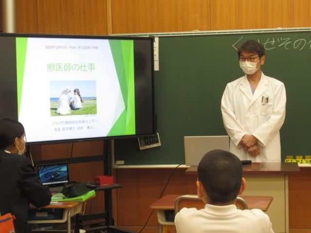 12/17(水) かなざわ動物総合医療センターの院長 田村兼人さんを講師にお招きし、獣医師のお仕事についてお話しをお聞きしました。田村さんは普段から「人と動物の絆」を大切にし、飼い主さんにも「命を預かる」という気持ちで家族に迎えてほしいとお話しされてました。他にも「命とは」「命の形」など、6年生が普段考えることのない形のないことを考えるきっかけとなりました。最後に「ありがとう」は魔法の言葉とも教えていただきました。
