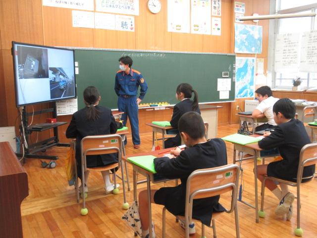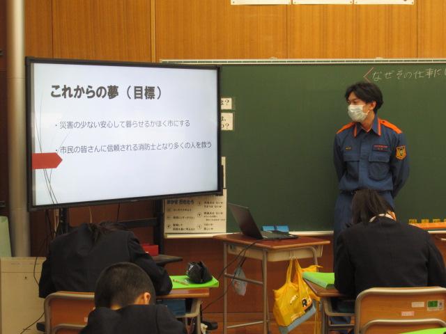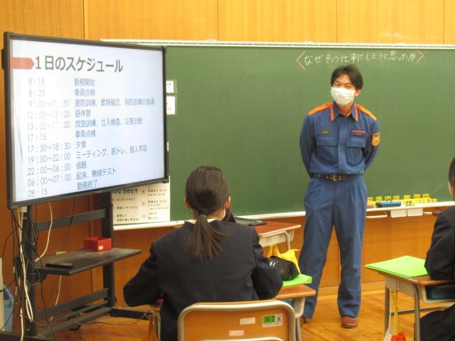 1/21(水)  「6年生キャリア教育」かほく市消防本部高松分署の山森さんに消防士となったきっかけややりがい、苦労などお話ししていただきました。消防士の方々のお仕事は火事や事故の他にも、予防課という普段あまり耳にすることのない仕事もあることがわかりました。また山森さんは最後に「消防士になるためには人の痛みのわかる優しい人であることが大切です」と話してくださいました。6年生キャリア教育は今年度は6業種の方々に貴重なお話しをうかがうことができました。 そして昼休みののびのびタイムには、今年度最後の松本さんの読み聞かせもありました。季節にあった鬼のお話 と、吹雪の中をドレスを届ける少女のお話しでした。松本さんは毎回季節に合った絵本を読んでくださり、児童も笑ったり歓声をあげたりと楽しい時間を過ごすことができました。一年間ありがとうございました。