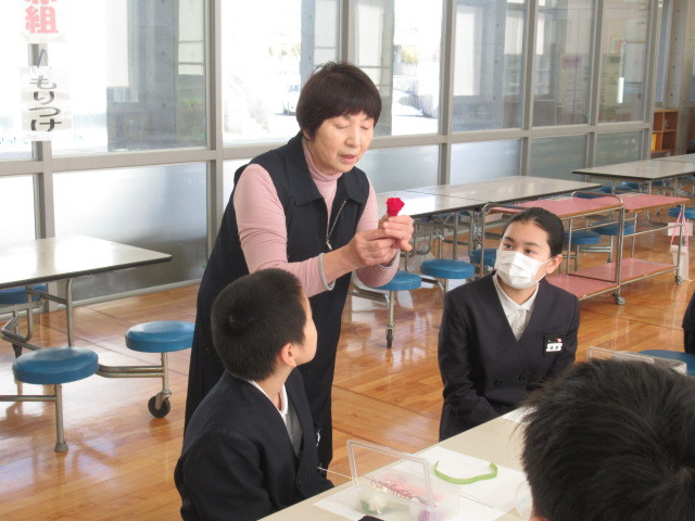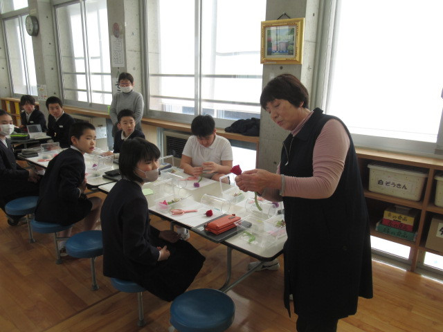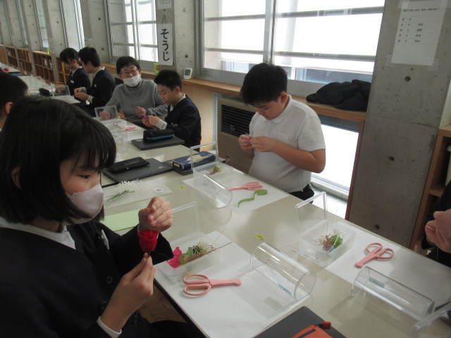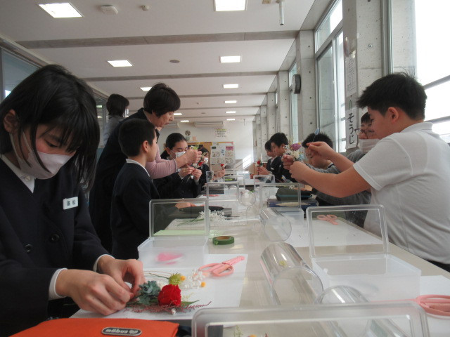2/17(火)6年生は卒業式で身に着けるコサージュを作りました。講師はプリザーブドフラワー講師の多田さんにお願いし、バラの花やそのまわりを彩る華やかなお花は6年生が自分で選びました。大切な卒業式で身に着けるコサージュ。配置や色合いを真剣に悩みながら作っていき、出来上がりは全員笑顔でした。あと少しで卒業式。このコサージュを着け、晴れの舞台に立つ6年生の姿を見るのが楽しみです。