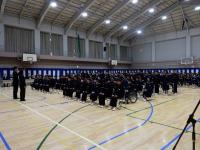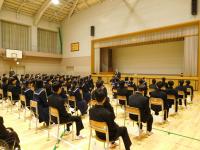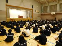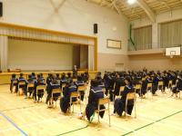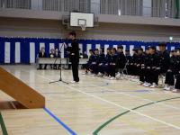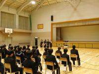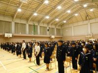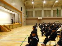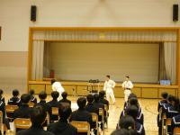 全校集会では県大会の報告会を行っています。県大会を勝ち抜いた柔道部員が北信越大会や全国大会に出場します。