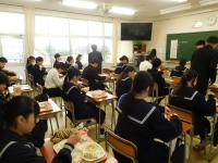 1年生の英語では重要センテンスを繰り返し音読しています。家庭科では調理実習でピザトーストを作っています。ピーマンや玉ねぎなどの具材を上手に刻んでいます。